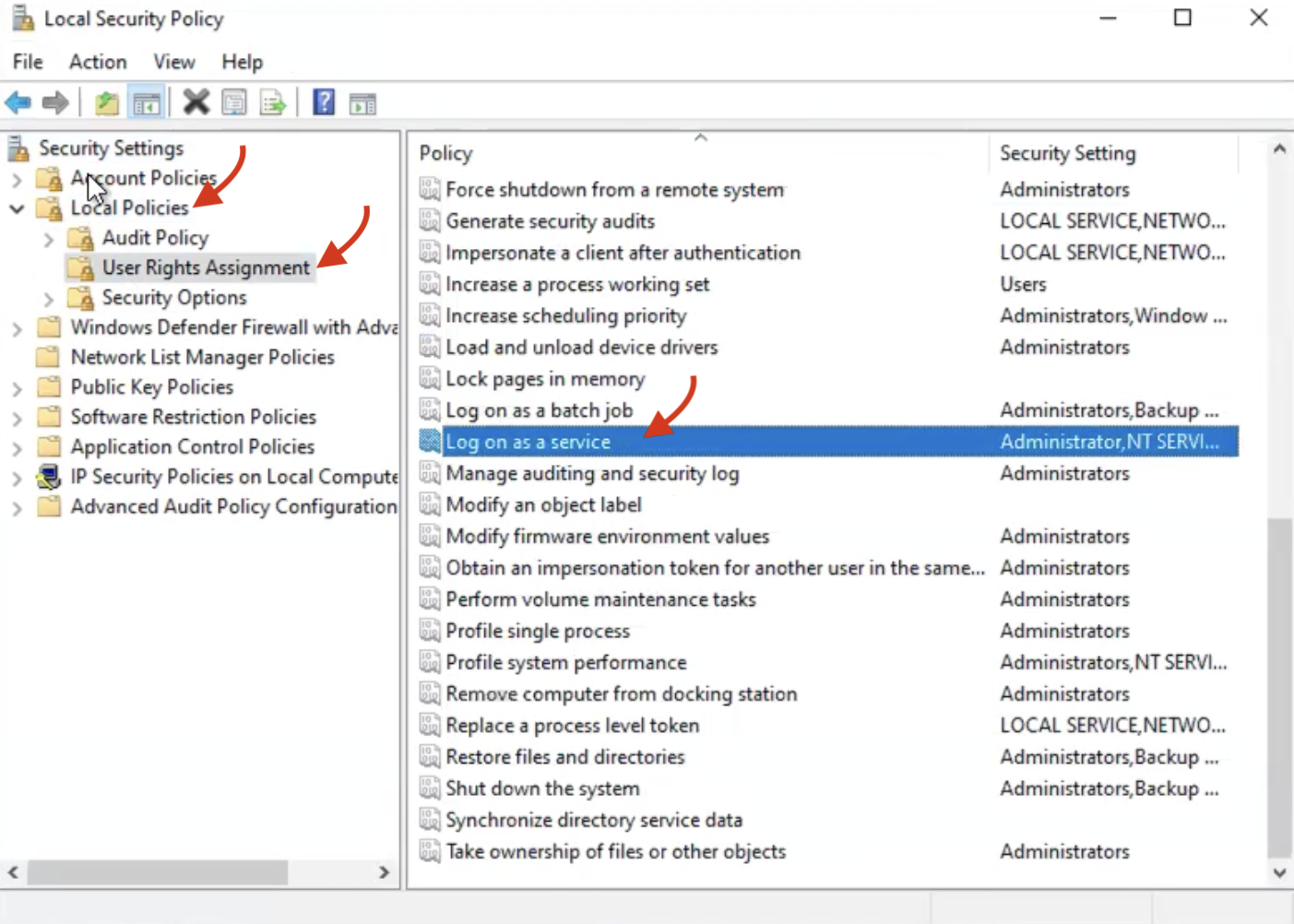 1. To verify this, navigate to Local security policy -> Local Policies -> User Rights Agreement -> Log on as a service.