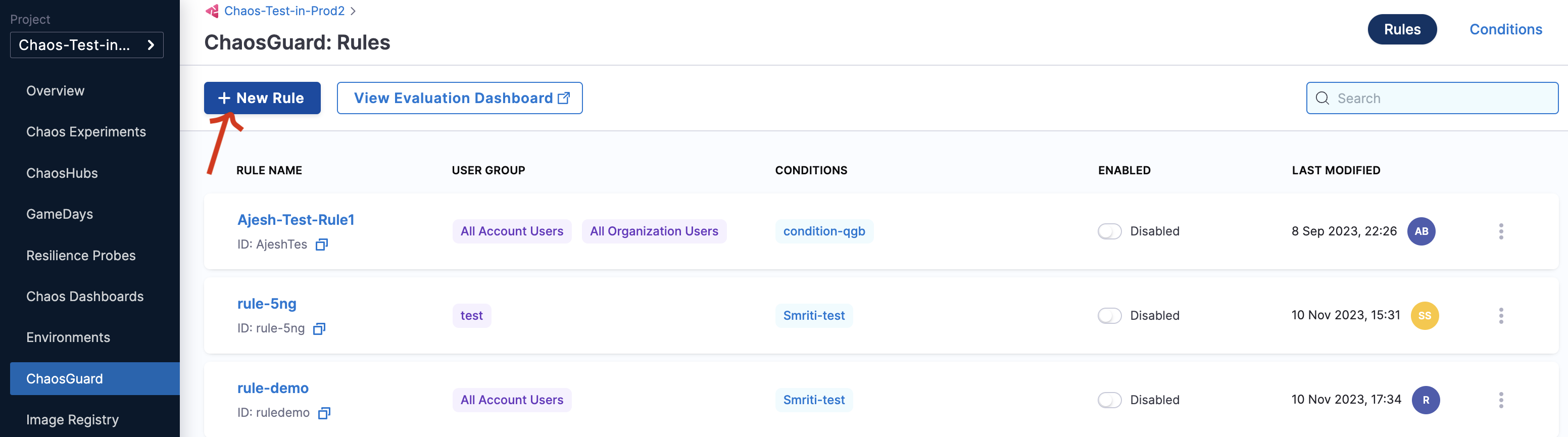 1. In the Chaos module, select ChaosGuard, and select Conditions. The Conditions page lists existing conditions (if any).