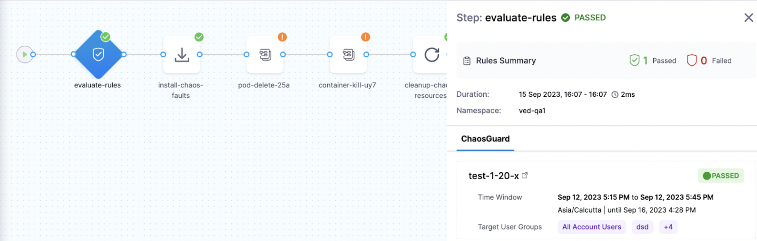 • Below is a snap that shows a successful evaluation of all the rules in a chaos experiment.