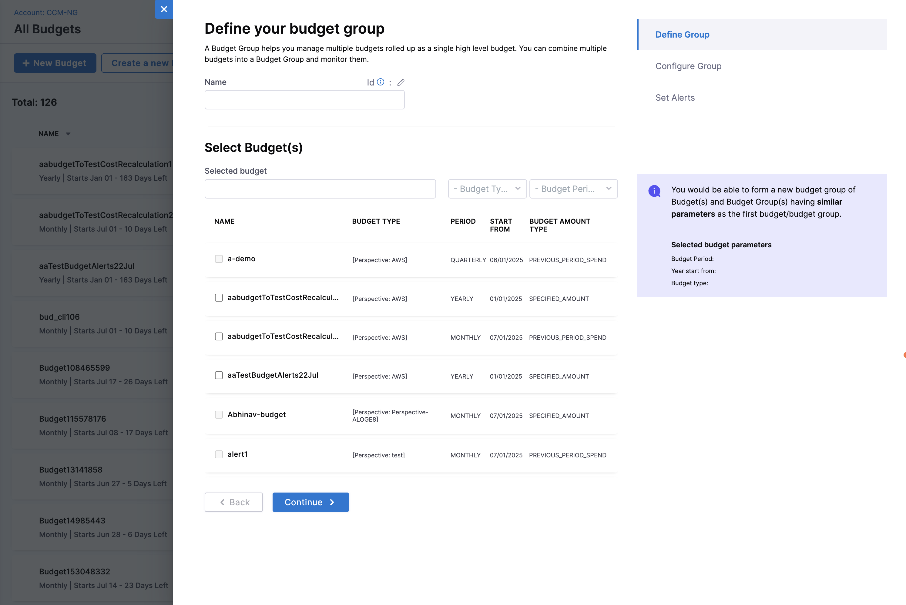 - Select the Budgets to create a group OR Budget groups to create a group. You cannot combine a budget and a budget group to create a Budget Group.