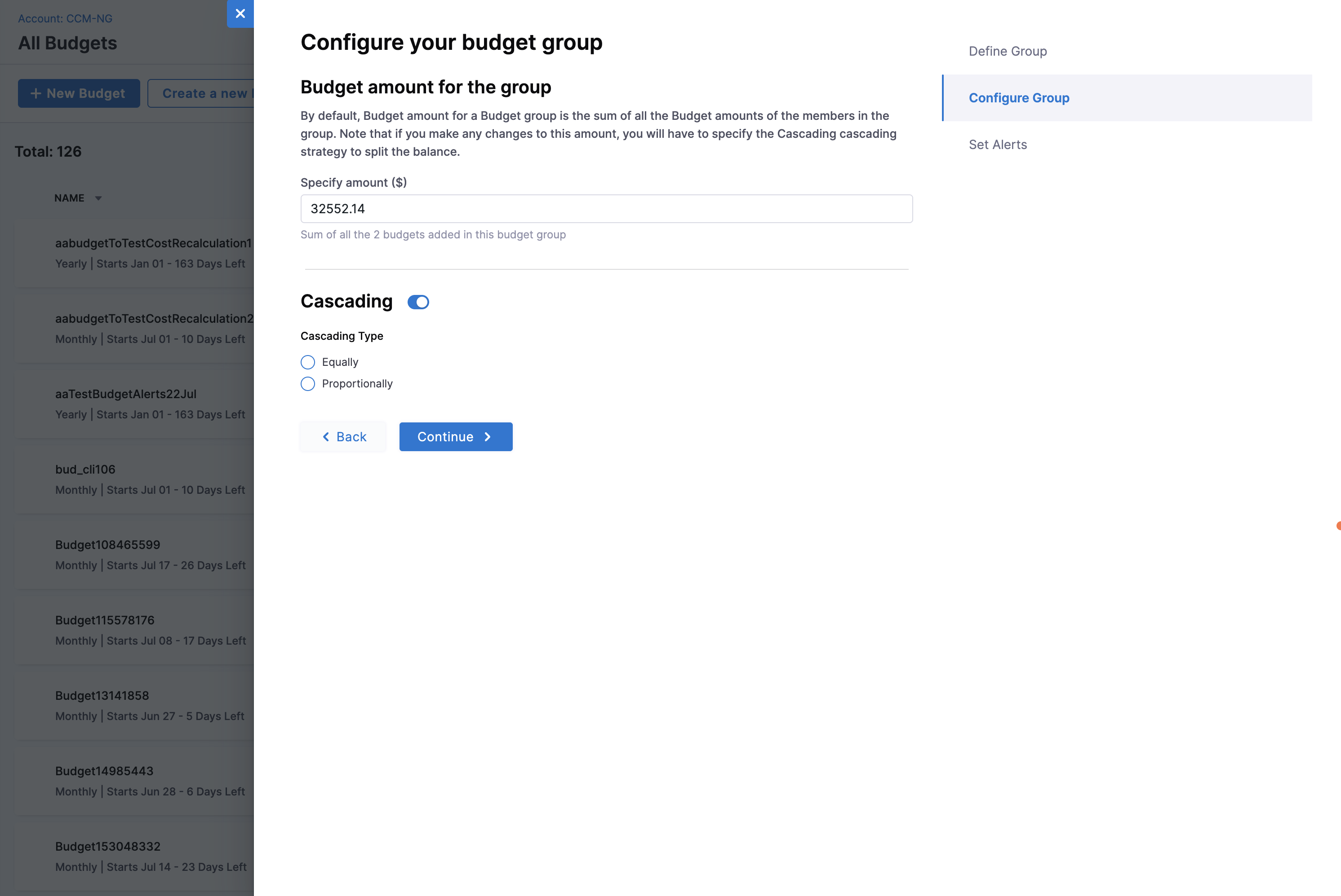 - Budget amount for the group: The sum of the budgets or budget groups selected in the previous step is displayed by default. You can edit this value. If you make any changes to this amount, you will have to specify the Cascading strategy to split the balance.