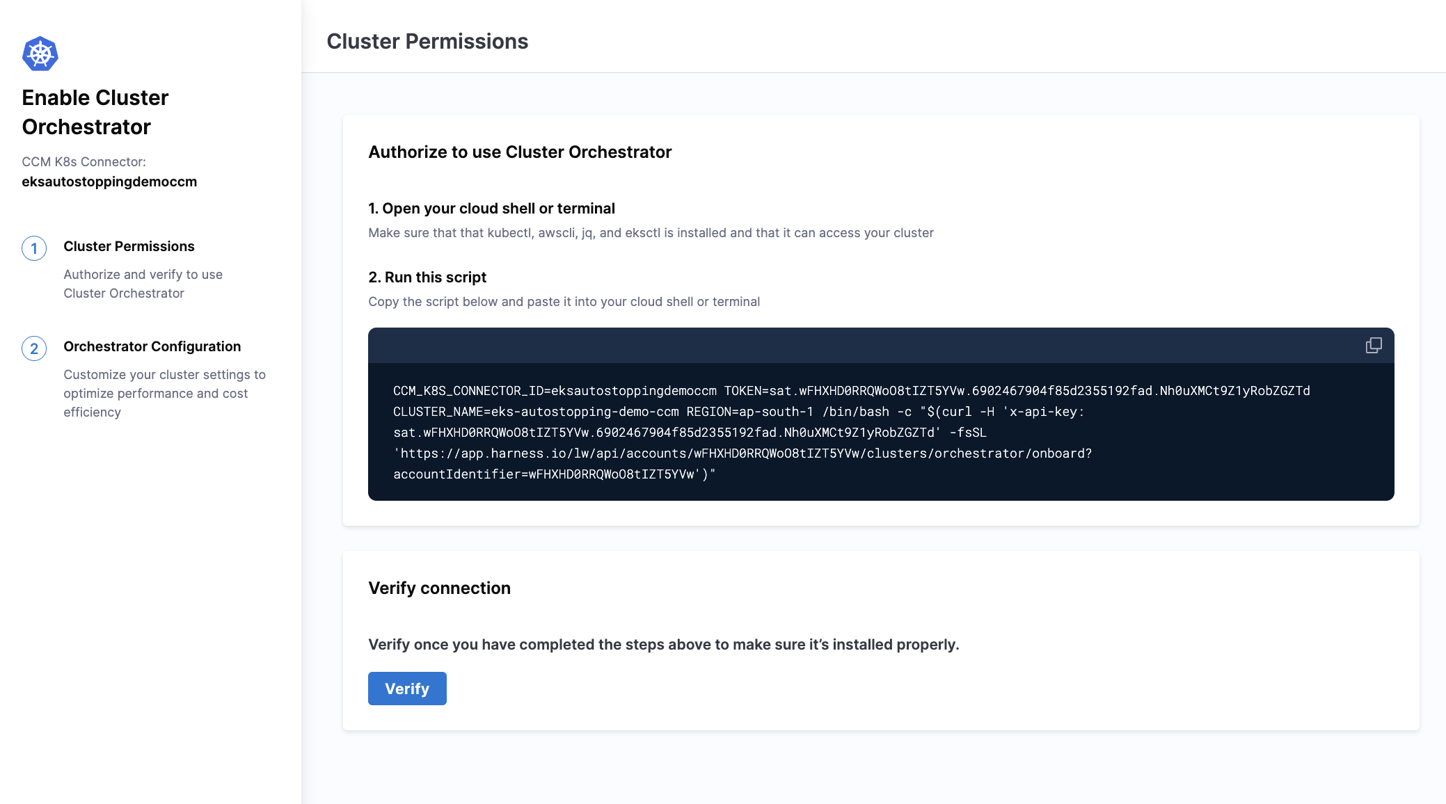 You will be asked to run a shell script in your terminal and verify the connection. Upon successfully establishing the connection, click on the next step to configure. Please make sure CLUSTER_NAME is set to the name of the EKS cluster you want to enable the Cluster Orchestrator for and REGION is set to the region of the EKS cluster.