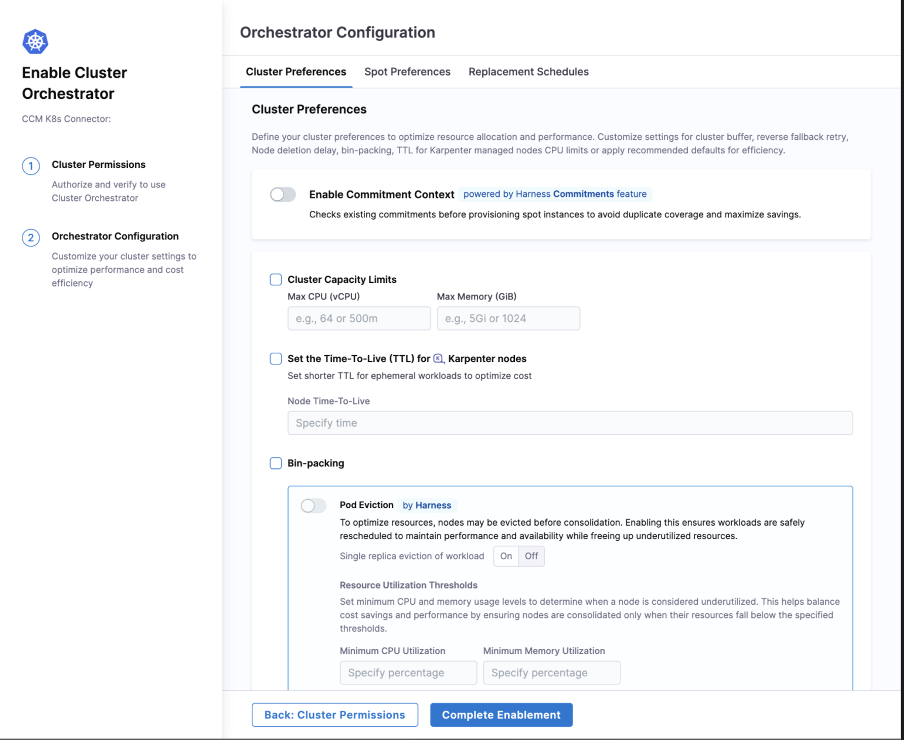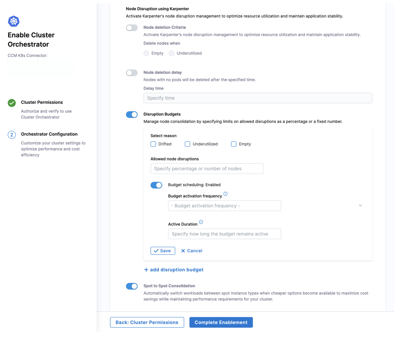 When enabling Cluster Orchestrator, you can configure various settings under the Orchestrator Configuration section: