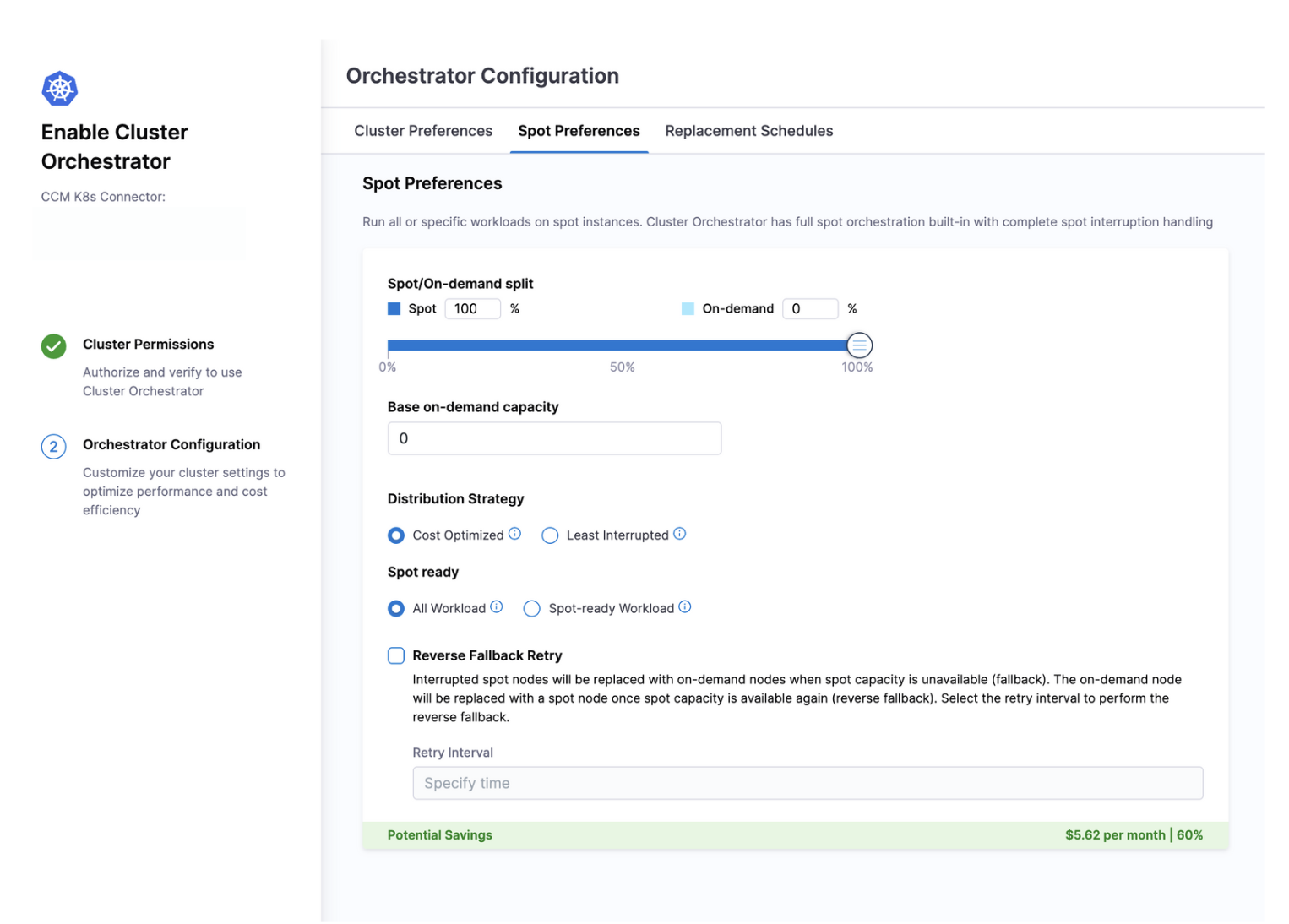 Reverse Fallback Retry: When spot instances are interrupted, Cluster Orchestrator automatically replaces them with on-demand instances (fallback). This setting controls how frequently the system attempts to replace those on-demand instances with spot instances once spot capacity becomes available again, helping you return to optimal cost efficiency.