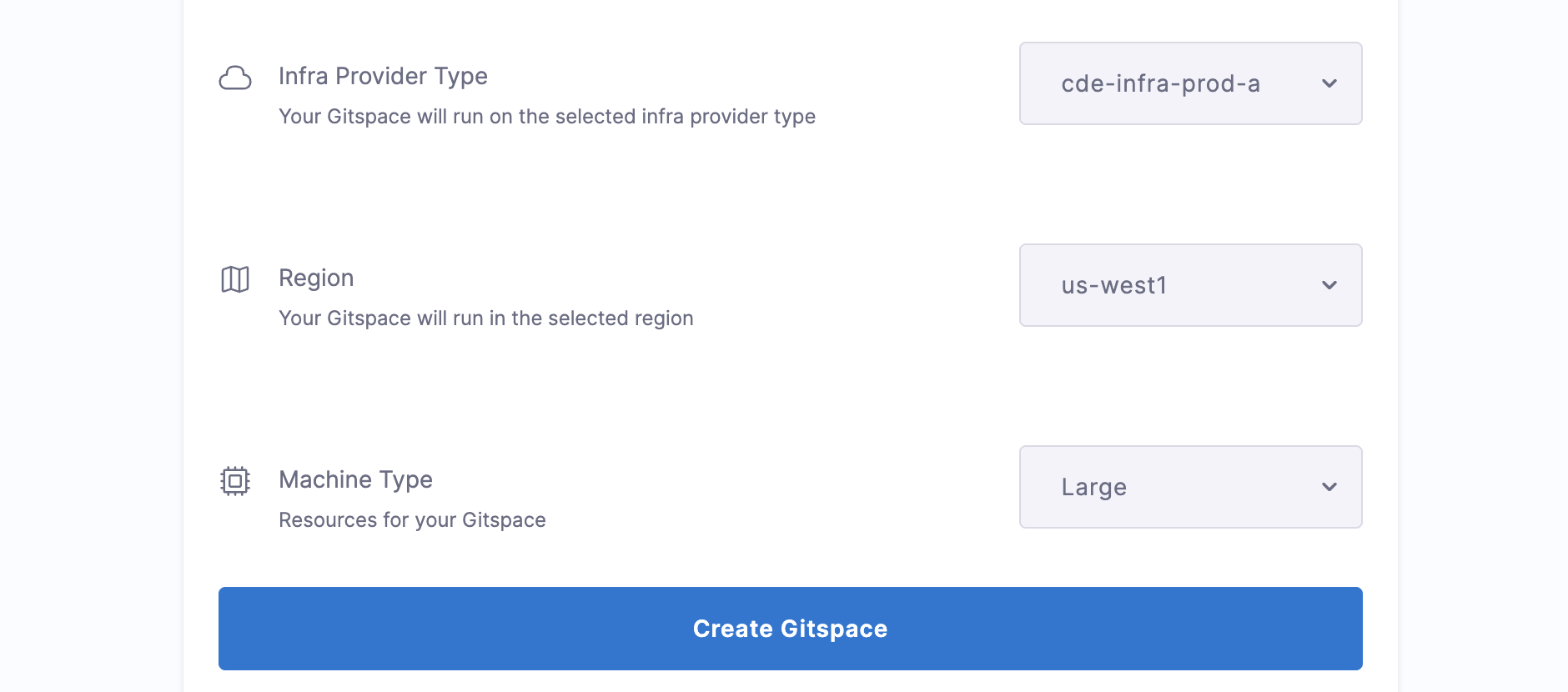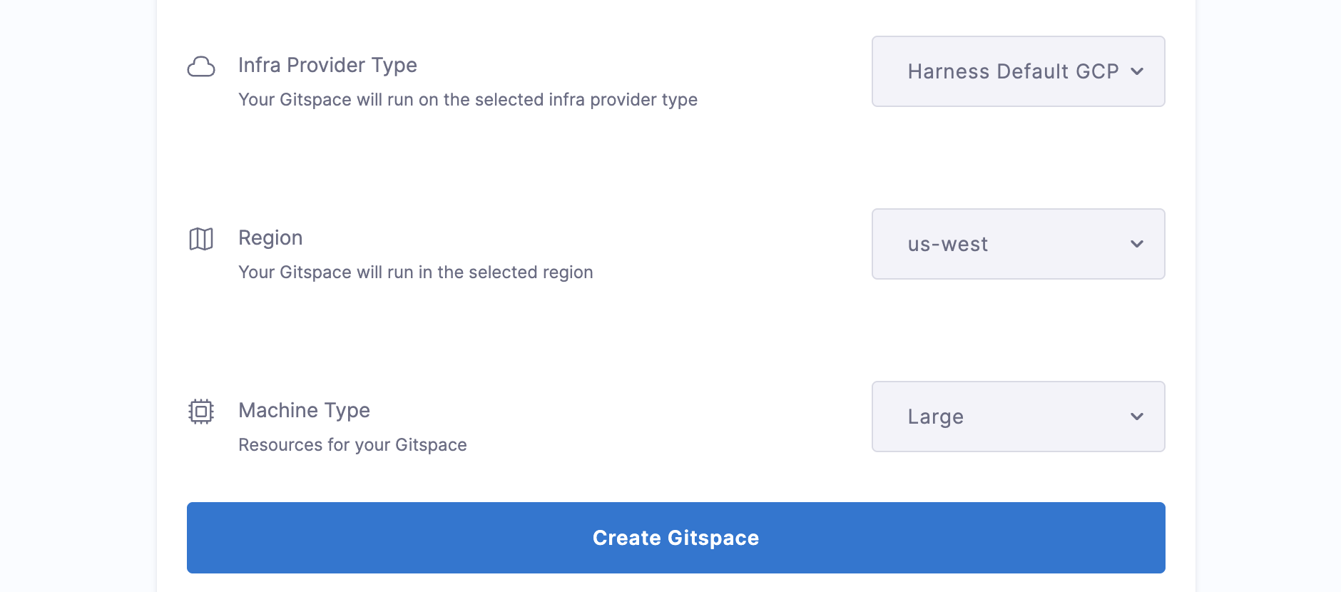 For Harness Hosted Gitspaces, no infrastructure configuration is required. All you need is your source code repository link and Gitspace details. Read more about Harness Hosted Gitspaces.