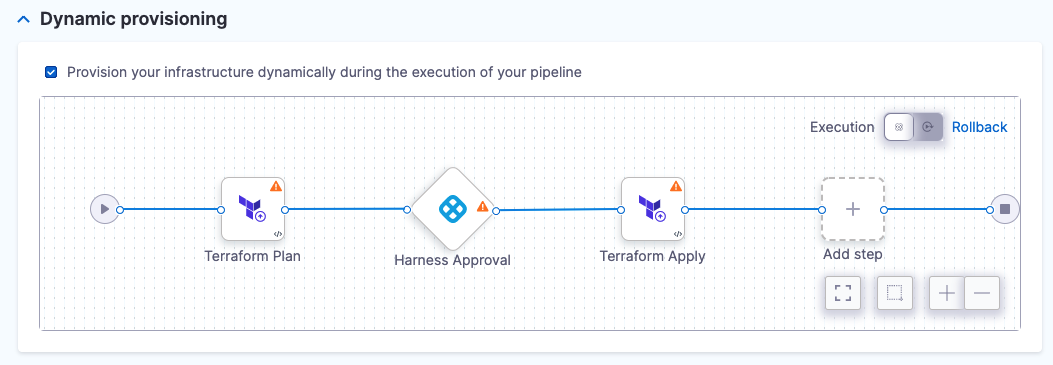 Harness automatically adds the Terraform Plan, Harness Approval, and Terraform Apply steps. You can change these steps, but plan, approve, and apply is the most common process. We use that process in our Terraform documentation.