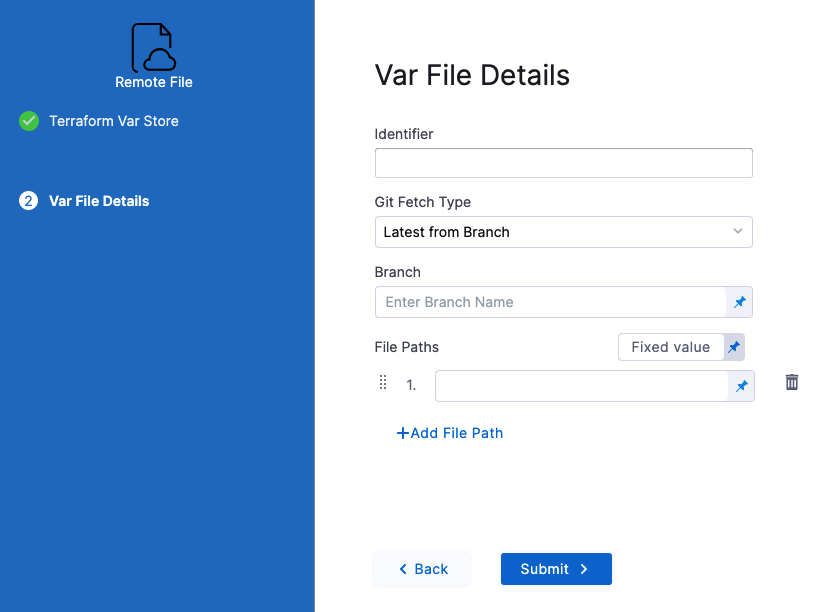 • Var file with identifier varfile1: <+pipeline.stages.test.spec.execution.steps.TerraformApply.git.revisions.varfile1>