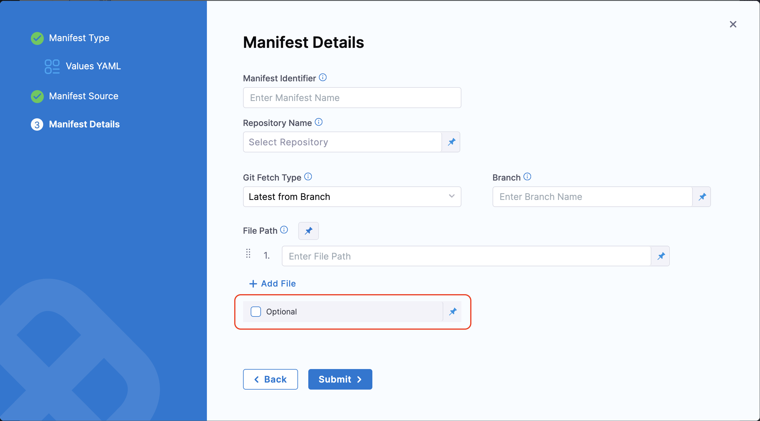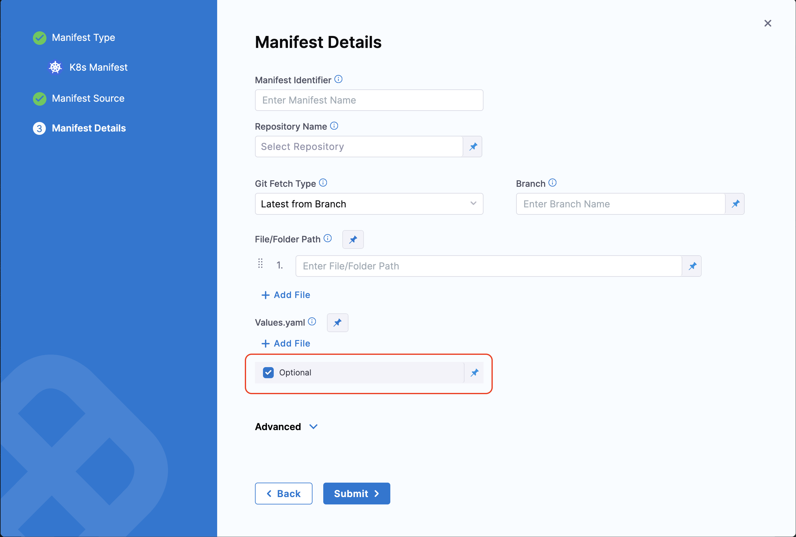 3. In the Manifest Details tab, enable the Optional checkbox next to the values.yaml placeholder.