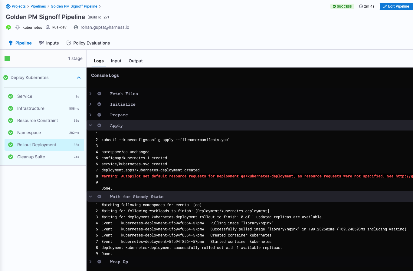 In this example, there is Rollout Deployment step to deploy the service to the environment.