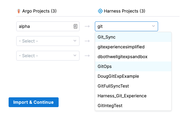 In each row, select the Argo project and the Harness project.