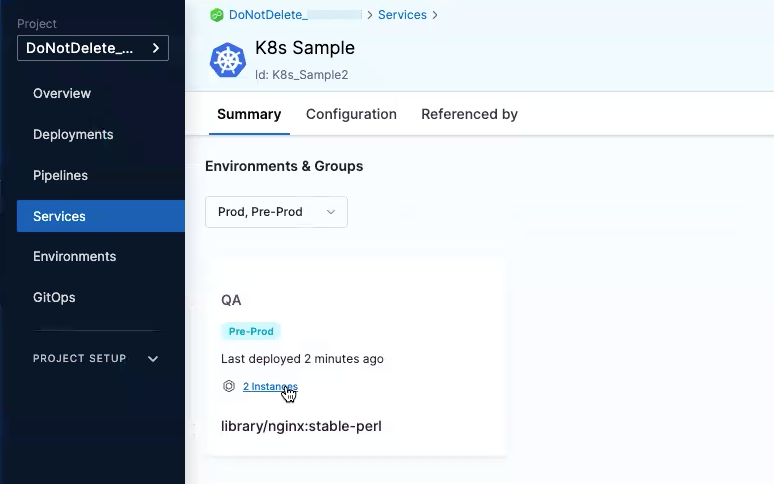2. In Summary, in the Environments & Groups panel, select the deployment you want to roll back, and then select the instances link.