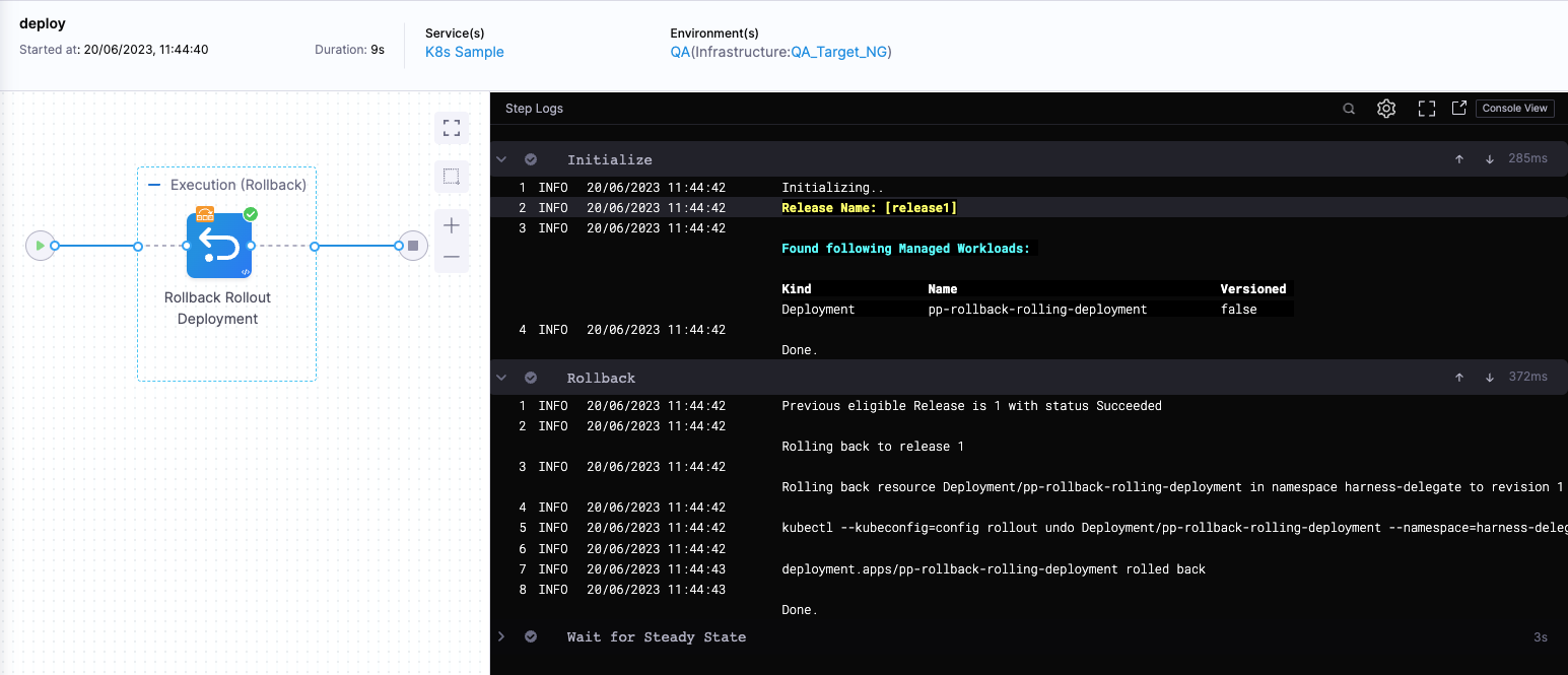 You will be directed to the pipeline execution page, and the Rollback Rollout Step will be executed.