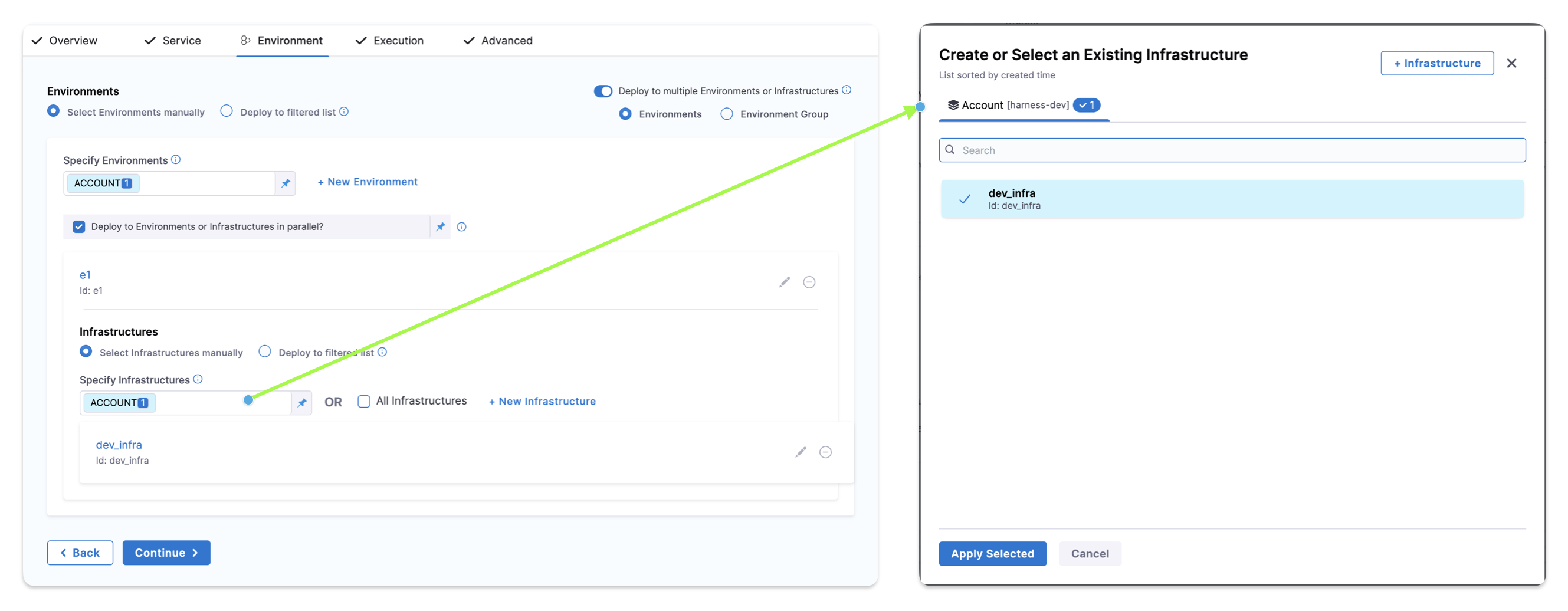 4. In Environments, enable Deploy to multiple Environments or Infrastructures. You can select one or more environments, and then one or more infrastructures in each environment.