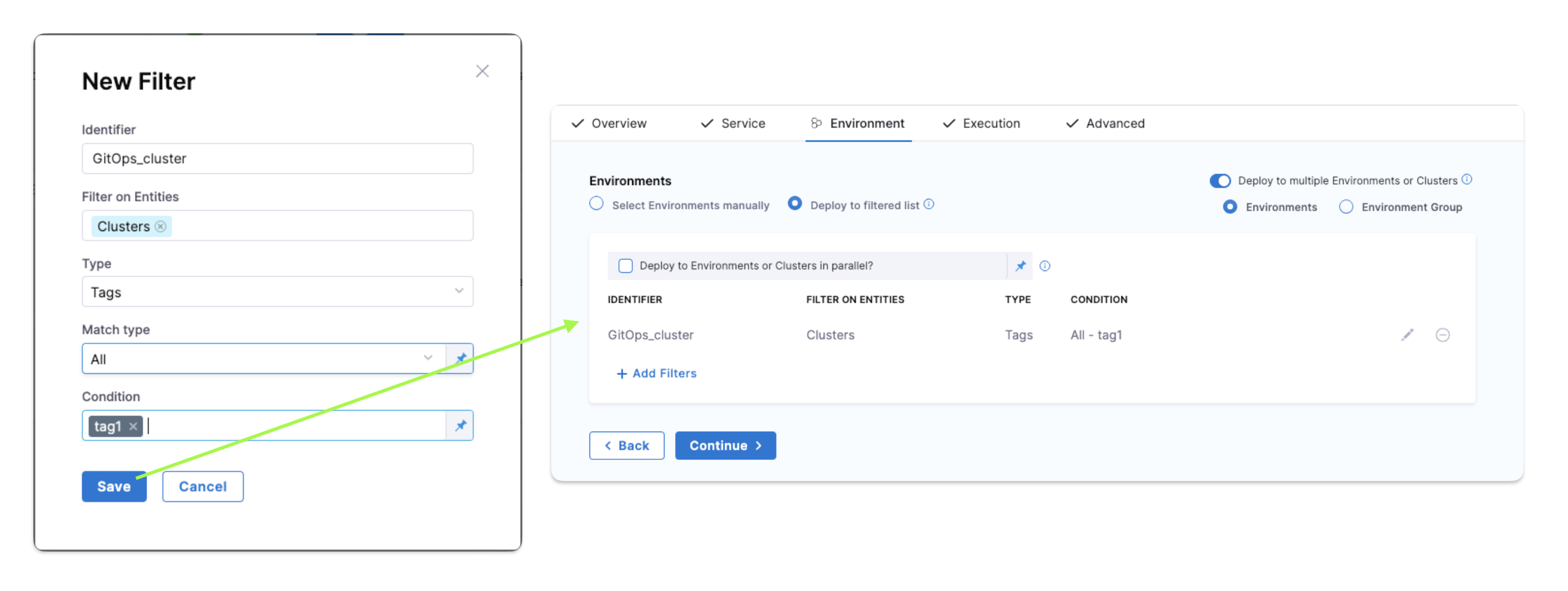 You can deploy services to the GitOps clusters in an environment using filtered list.