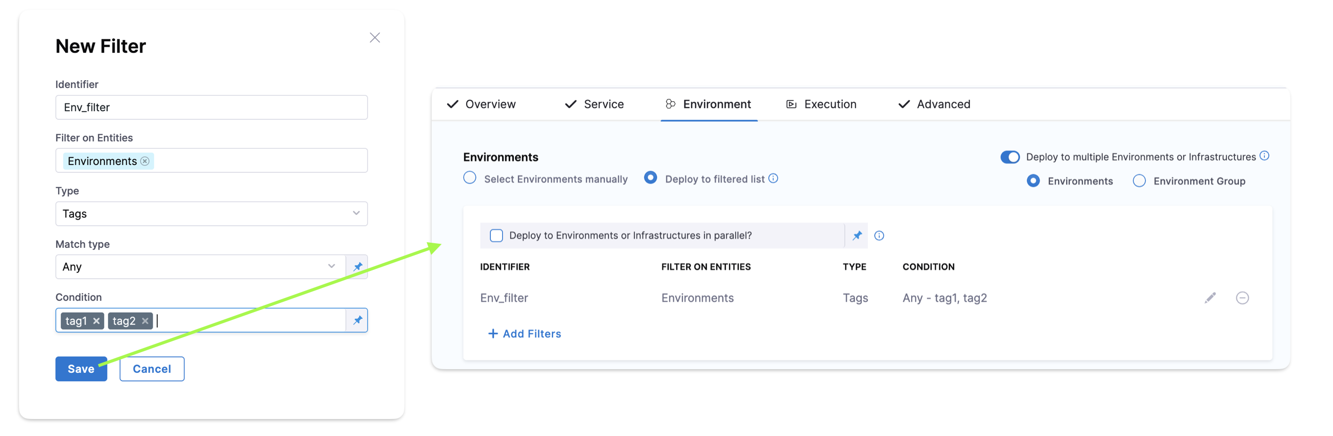 8. Under Identifier, enter the name of the filter. In FILTERS ON ENTITIES, select Environments.