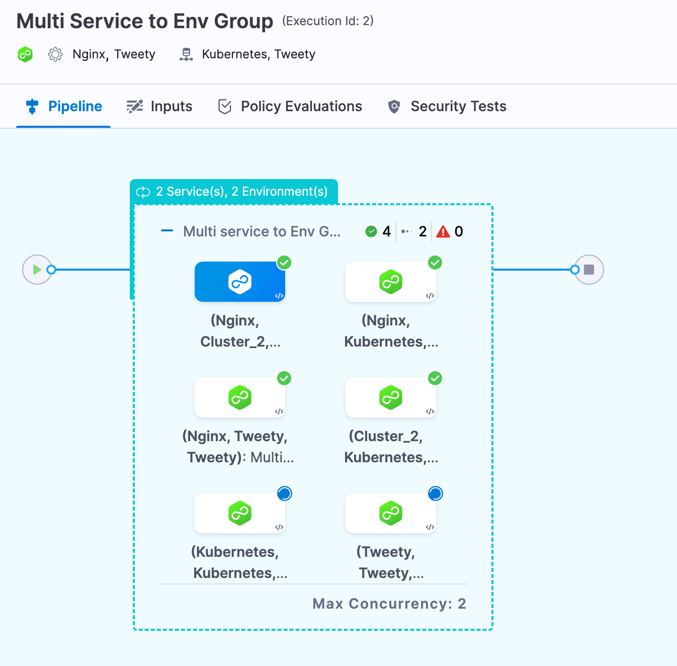 • If you select Deploy services in parallel and Deploy to Environments or Infrastructures in parallel, Max concurrency is equal to the number of services multiplied by the number of environments.