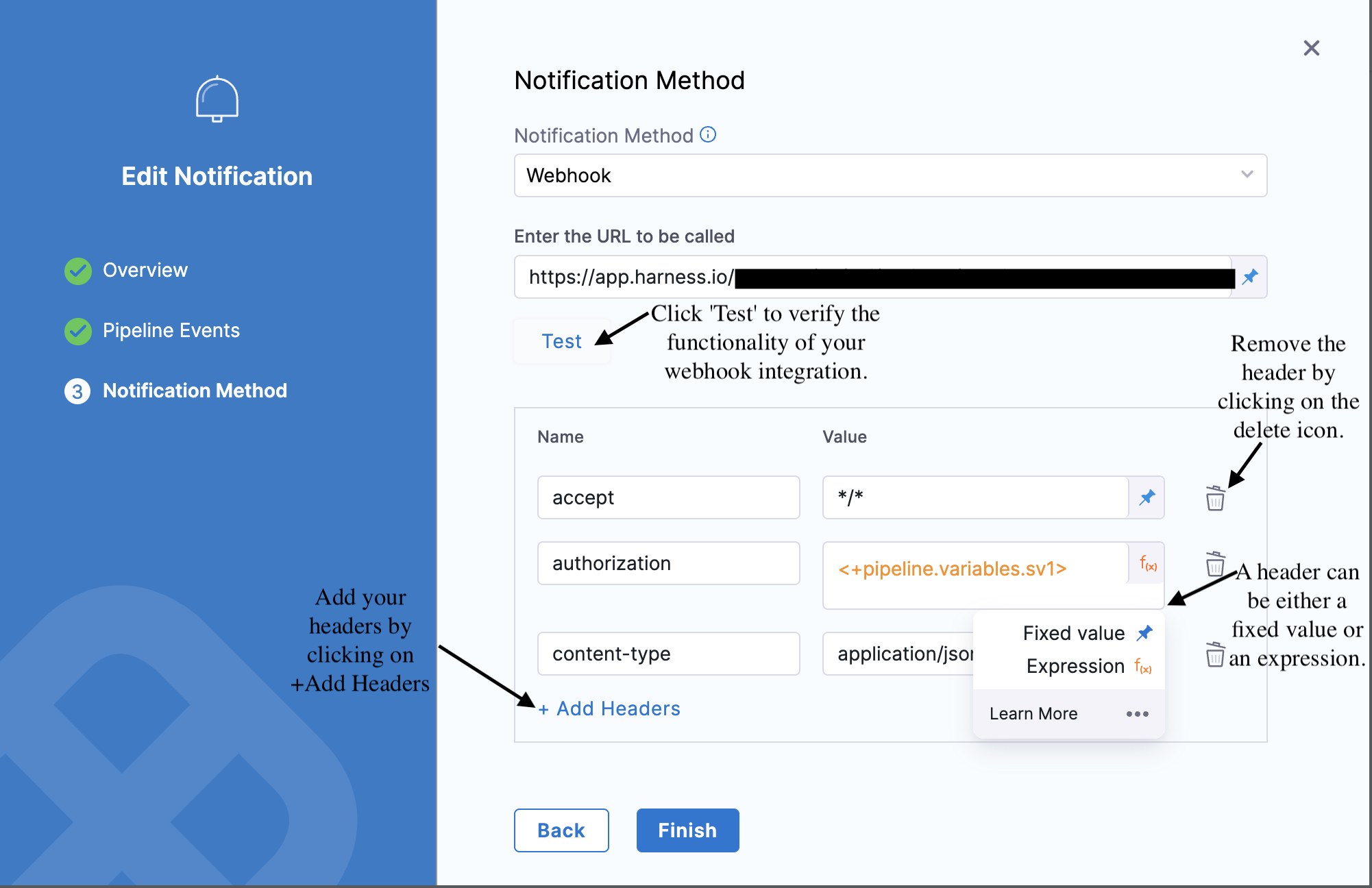 Webhook notification method allows you to add custom headers consisting of key-value pairs.