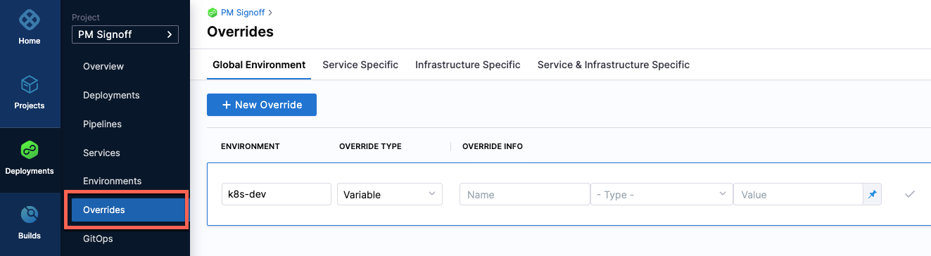 Harness has introduced an enhanced experience for service, environment, and infrastructure overrides in Continuous Delivery (CD). A new page, named Overrides, is added in Deployments. In Overrides, you can define overrides for services, environments, and infrastructures.