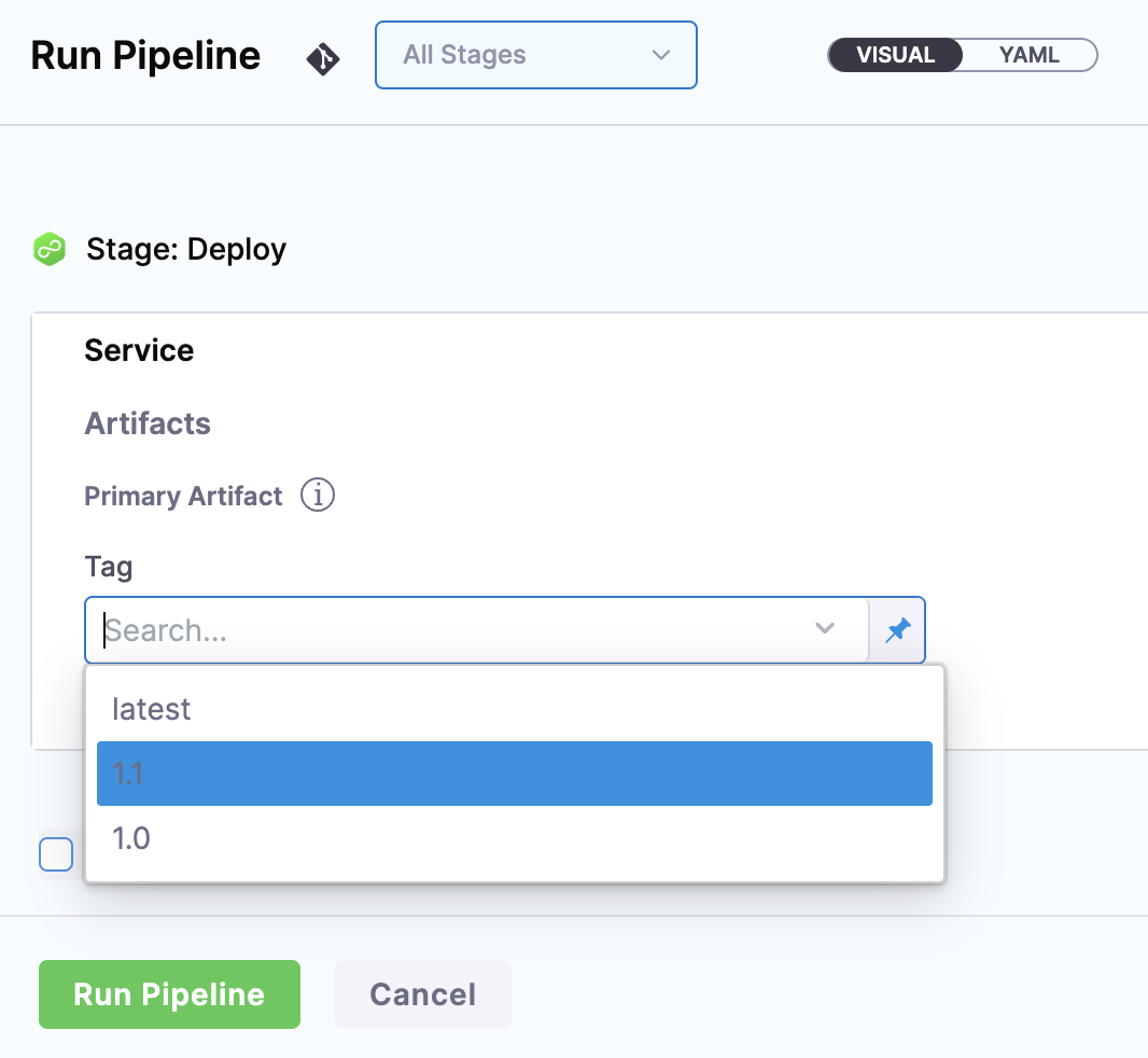 You can select a specific tag/version, use a runtime input so that you are prompted for the tag/version when you run the pipeline, or you can use an Harness variable expression to pass in the tag/version at execution.