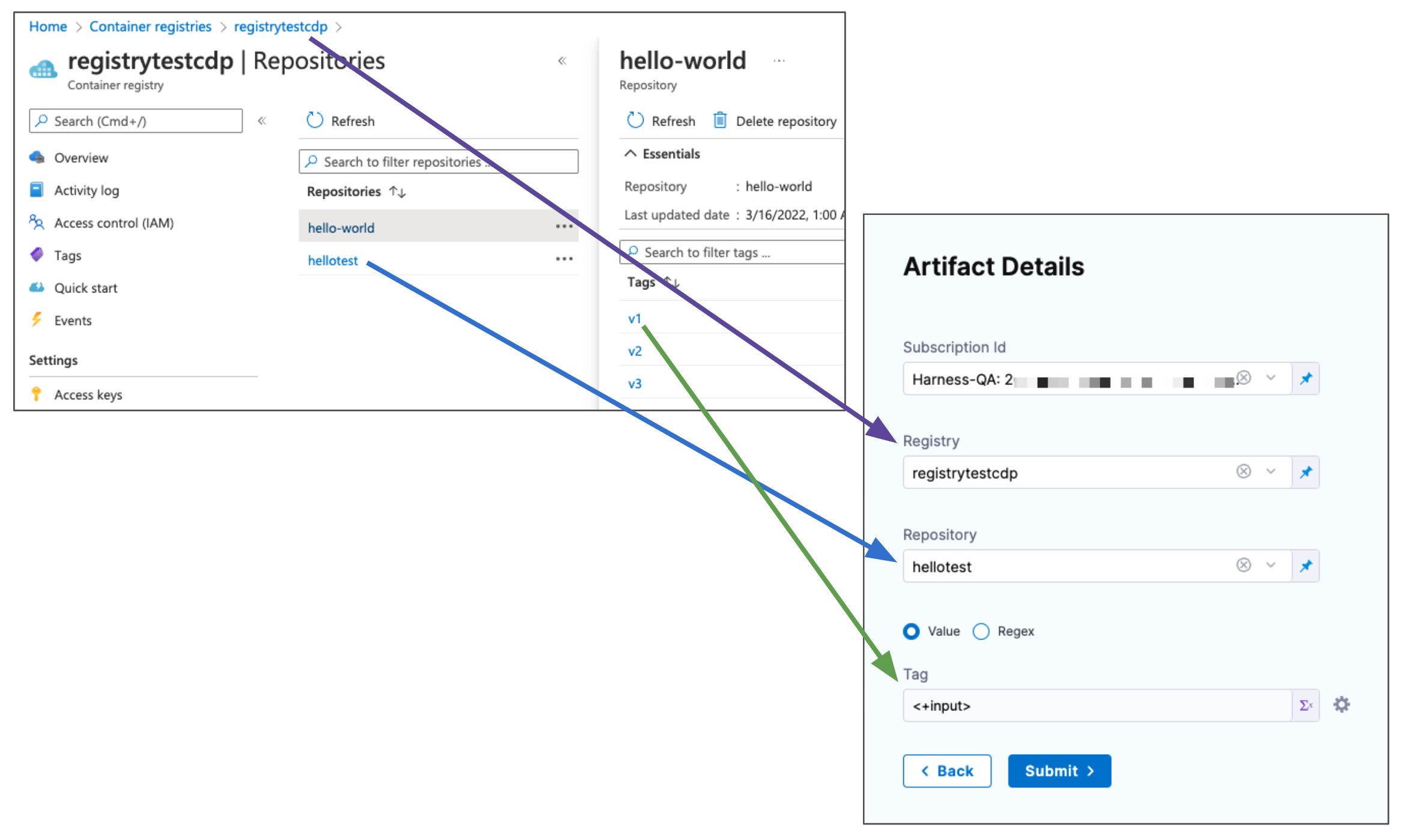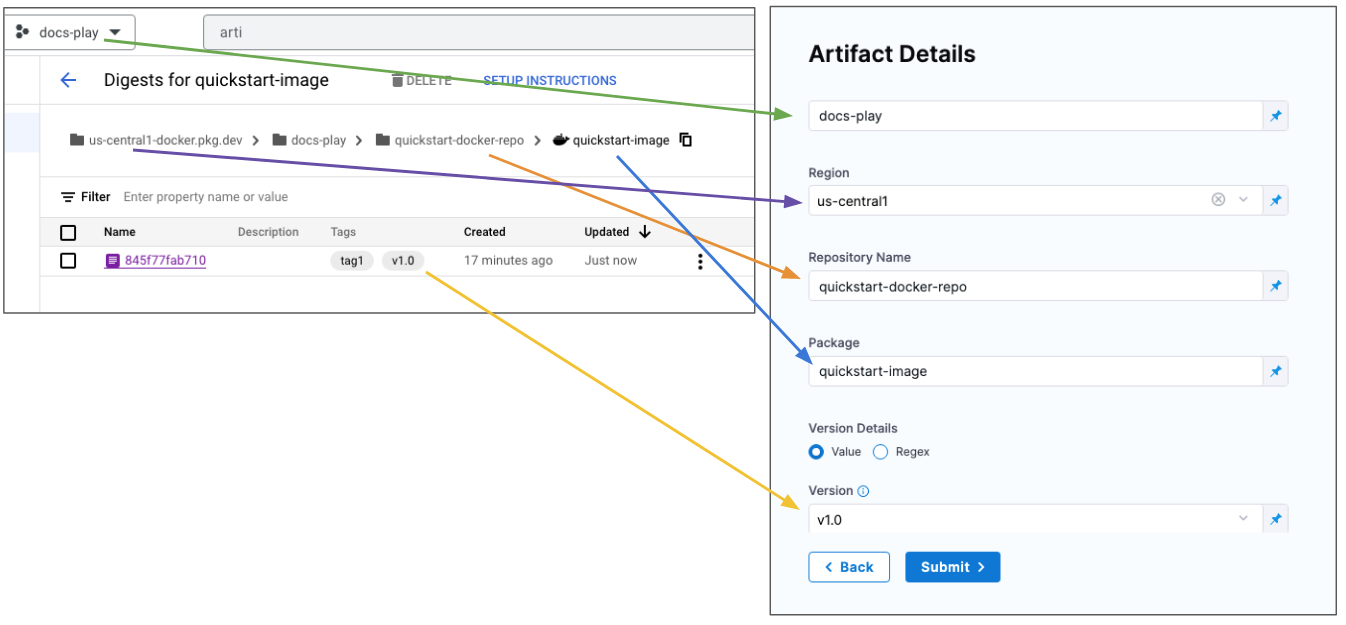 When you select the artifact repo for the artifact, like a Docker Hub repo, you specify the artifact and tag/version to use.