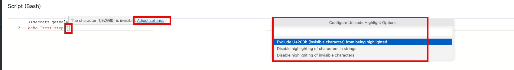 When invisible characters are present, users will see a highlighted space in their scripts.