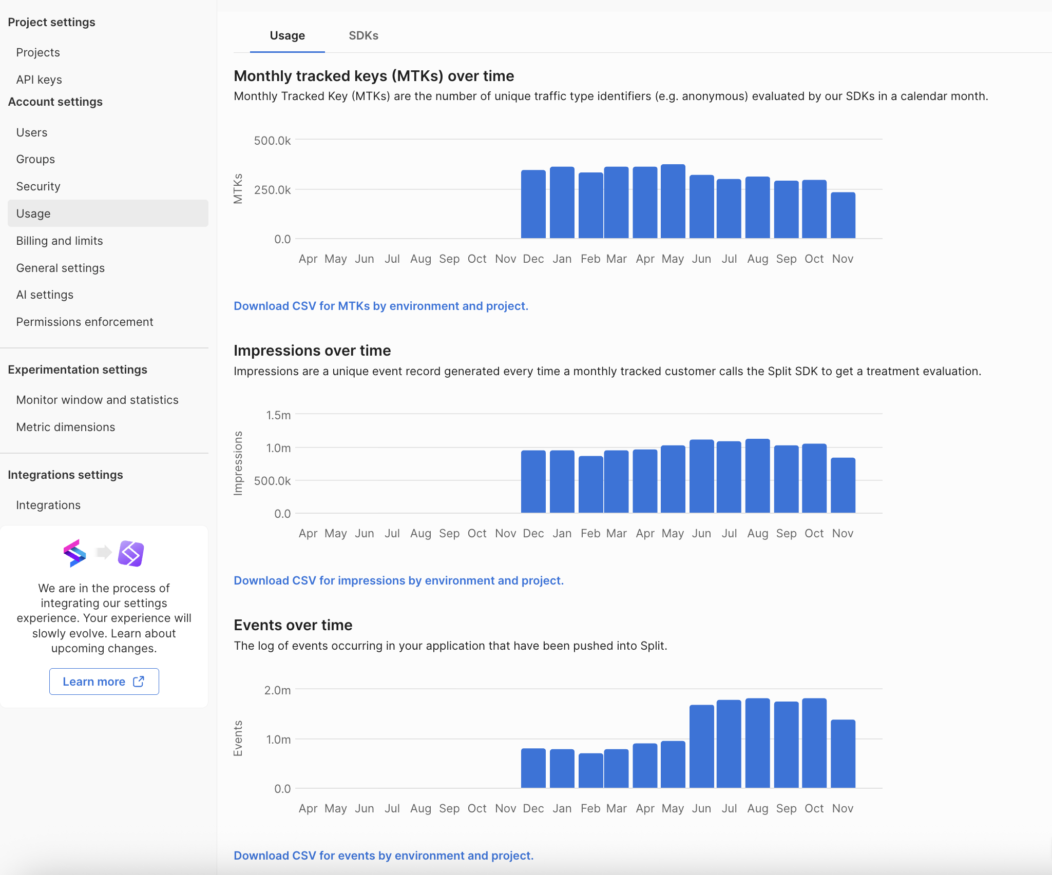 You can export each usage report as a CSV file by clicking the Download CSV by environment and project link under each chart.