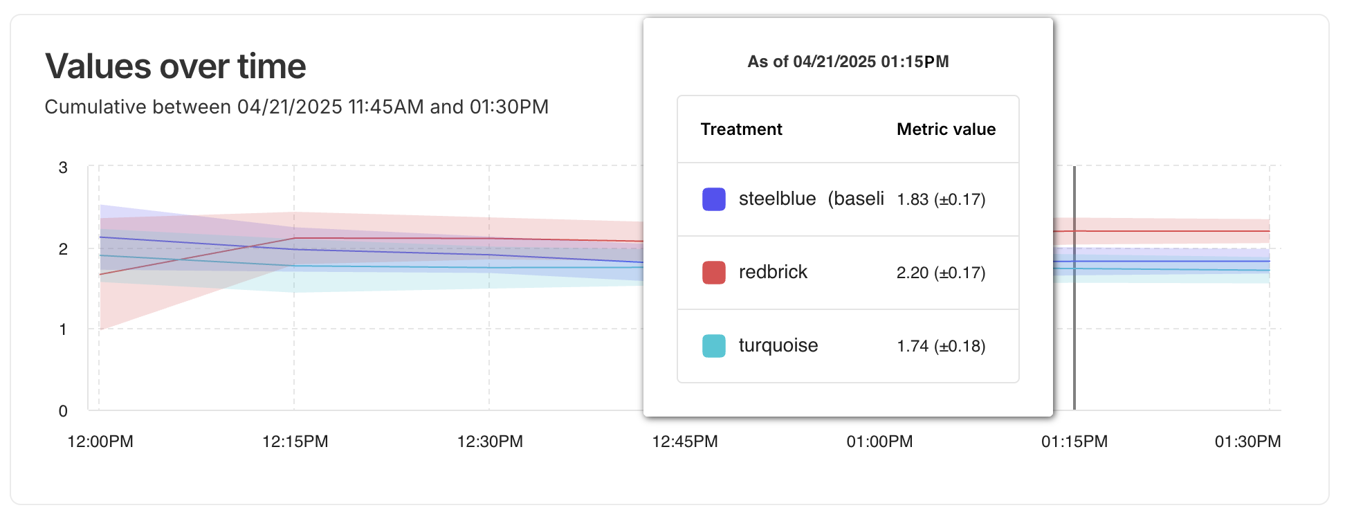 The shaded area around each line is the confidence interval (CI). Seeing the CI bands over time tells you how confident you can be in the metric at any point during the test. If the confidence intervals for two treatments don’t overlap, that’s a strong visual cue that the difference might be statistically significant.