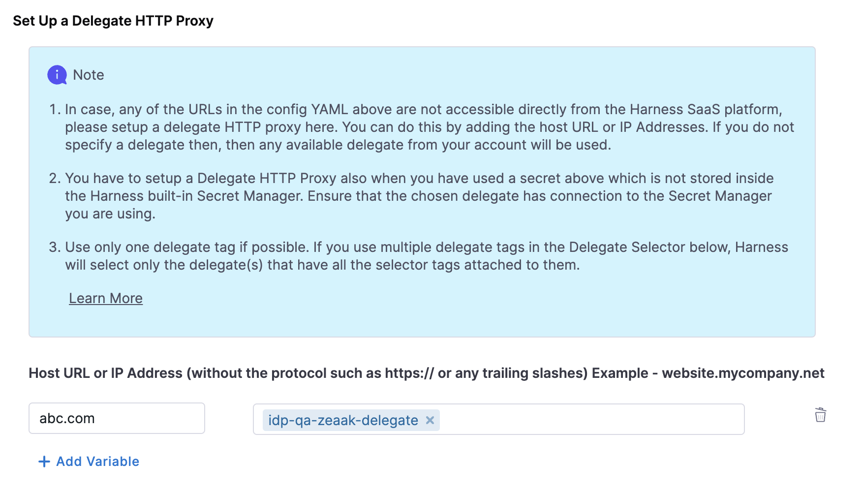 3. Configure Delegate Proxy (Delegate HTTP Proxy) (in case the API is not publicly accessible, or the secret is on your infrastructure)