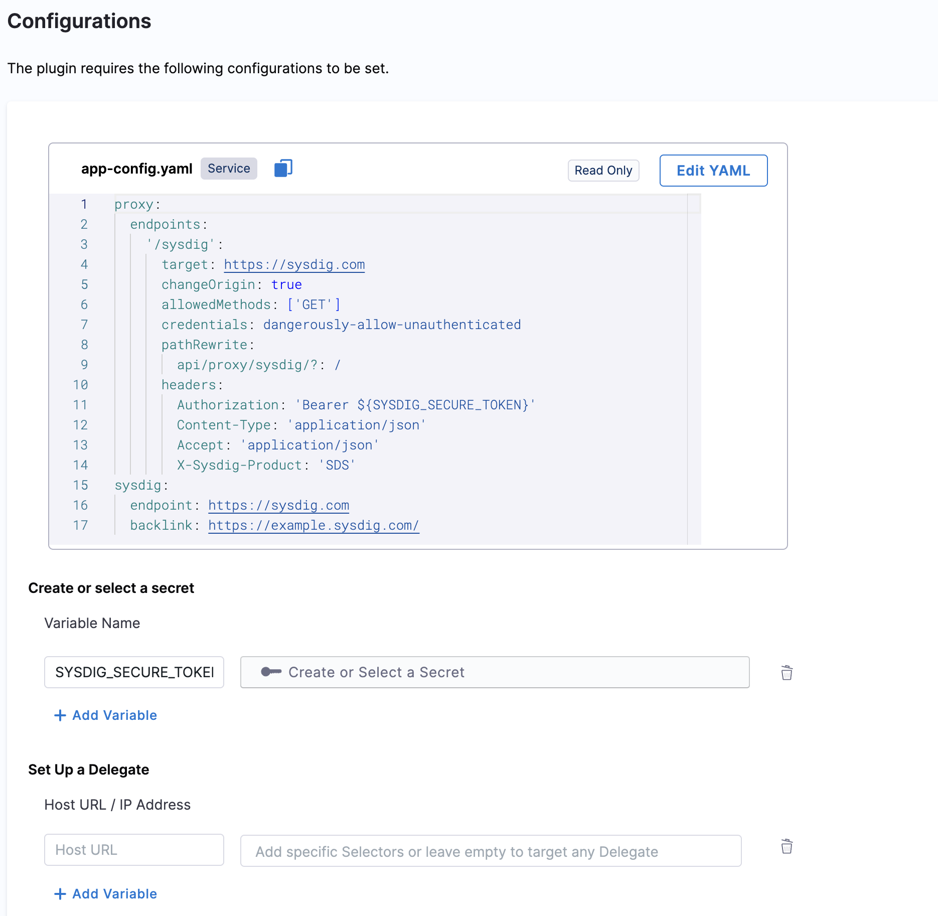 • If your Sysdig instance is behind a firewall, e.g.,sysdig.mycompany.com will not be accessible directly from Harness SaaS clusters, a delegate proxy has to be setup. Please ensure you have Harness Delegate installed for the same.