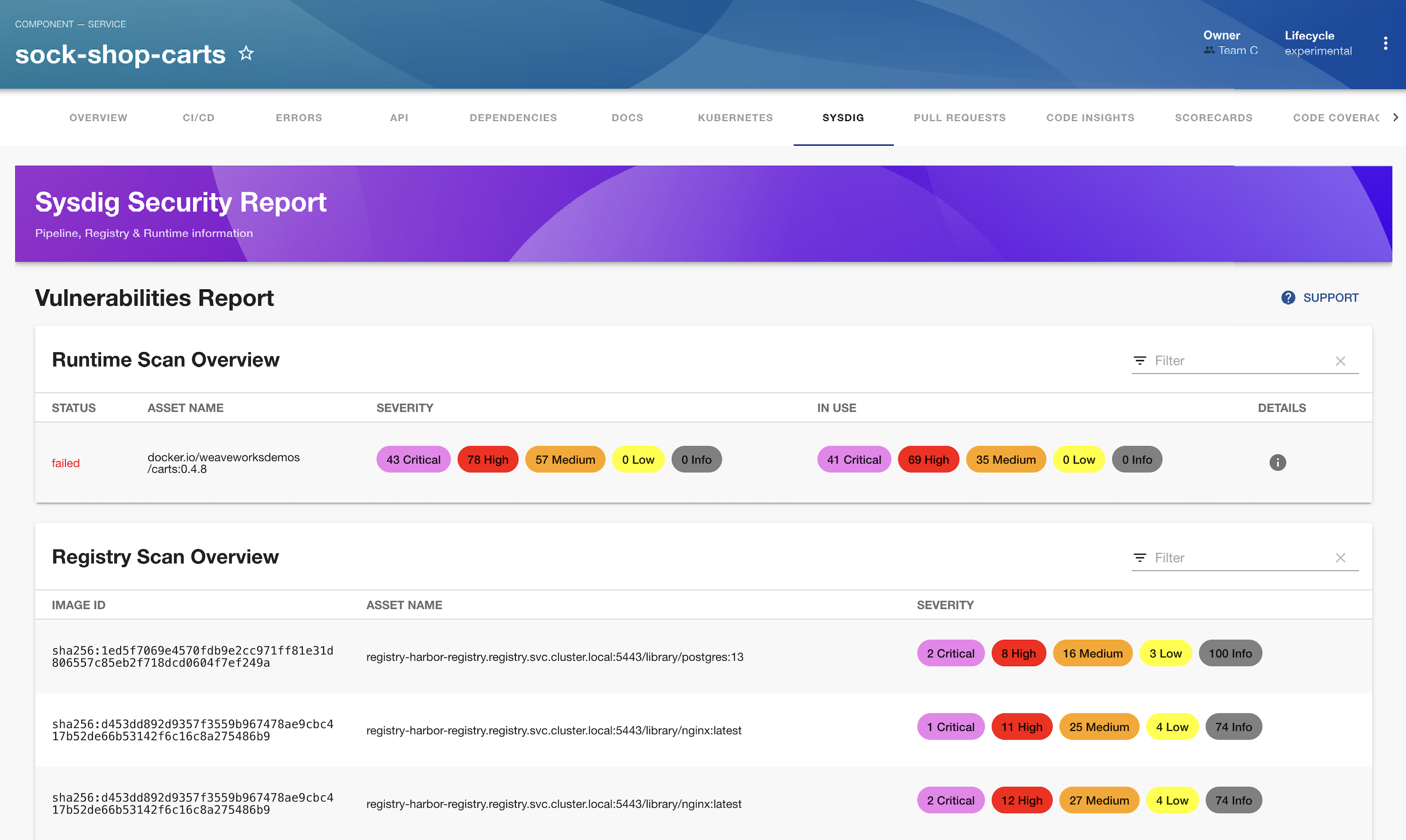 The plugin is owned by Sysdig and managed in the Backstage repository as an open-source project. Create a GitHub issue to report bugs or suggest new features for the plugin.
