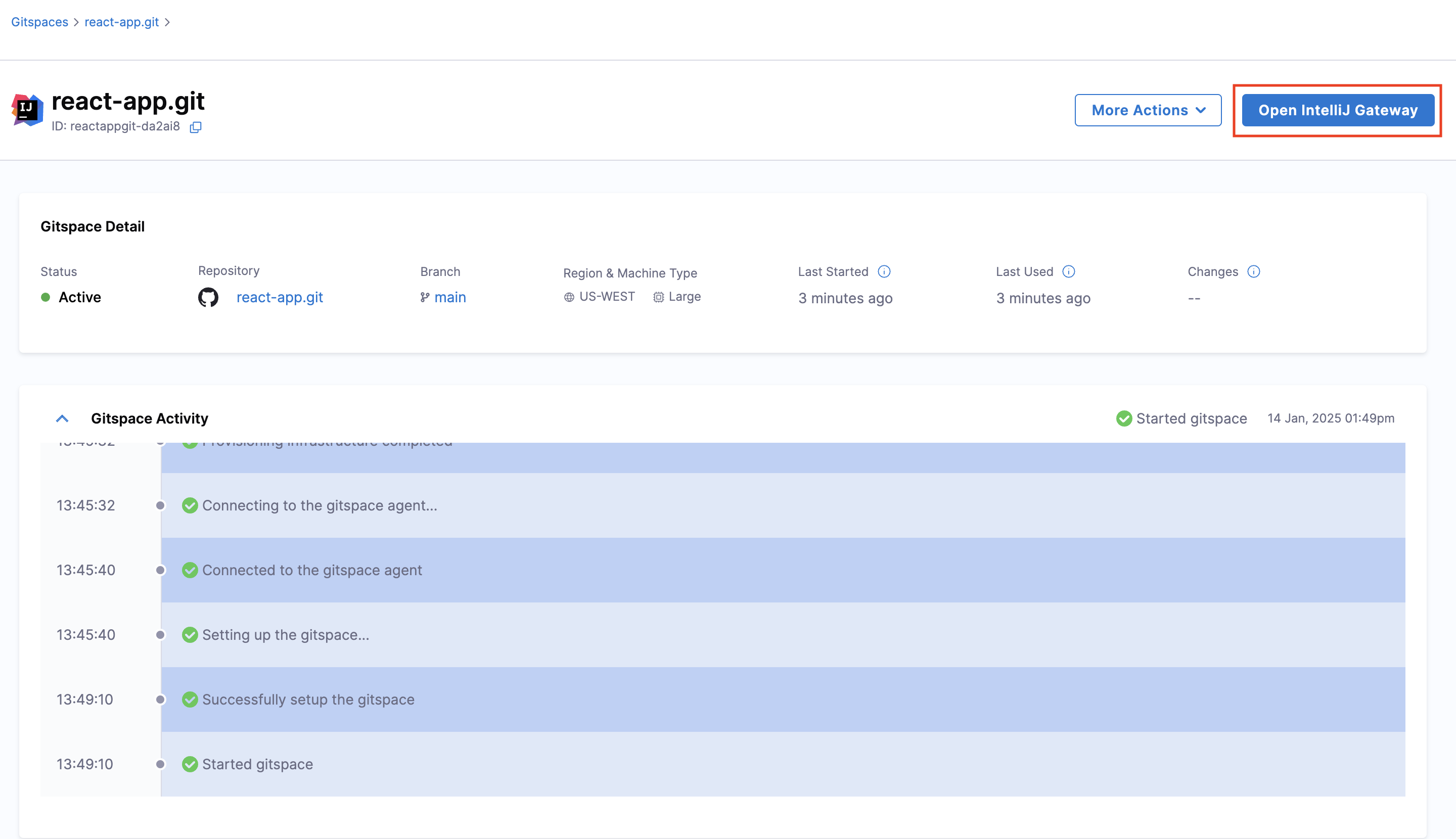 1. Once the Gitspace is created and running, click on the "Open IntelliJ Gateway" button.