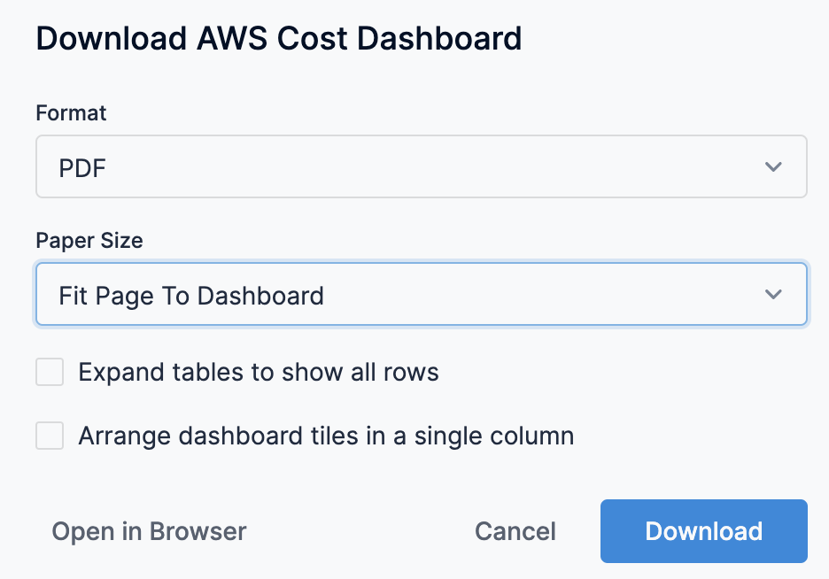1. In Download AWS Cost Dashboard, in Format, select PDF.