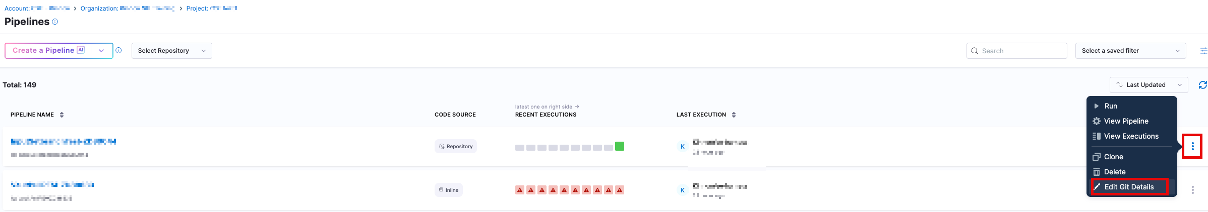 2. Click on the three dots (...) at the side of the appropriate pipeline. Select Edit Git Details