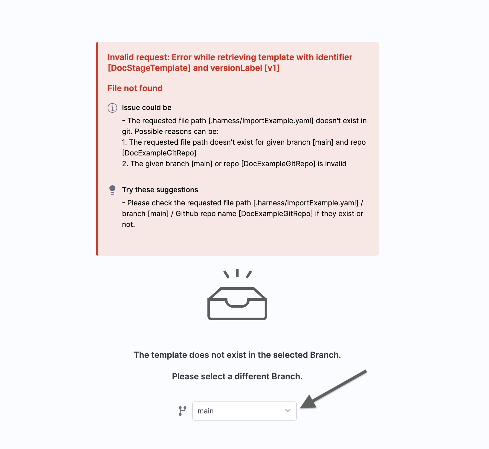 By default, Harness fetches your Template details from the default branch. If you have imported Template from some other branch, select the branch from where you imported the Template and continue.