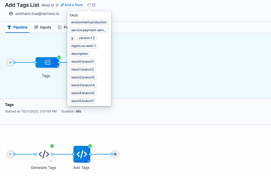 Harness supports dynamic tagging of pipeline executions, enabling you to attach contextual metadata as tags during runtime. These tags become part of the execution record and can be used with Harness’s standard tag-based search and filters to quickly locate specific runs.