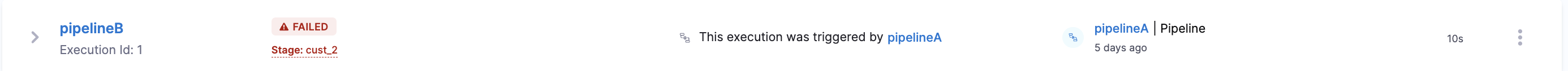 • Artifacts, test results, and other output produced by chained pipelines are available in the execution details for the chained pipeline that produced those outputs. This information is not stored in the parent pipeline's execution details.