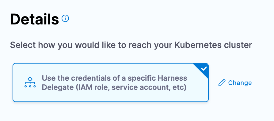 The delegate is deployed via manifest or Helm Chart and exists as a deployment inside the target cluster. You will need some configuration items such as your Harness account URL and a delegate token, which authenticates the delegate to your Harness account and scope where the delegate is created inside of Harness.