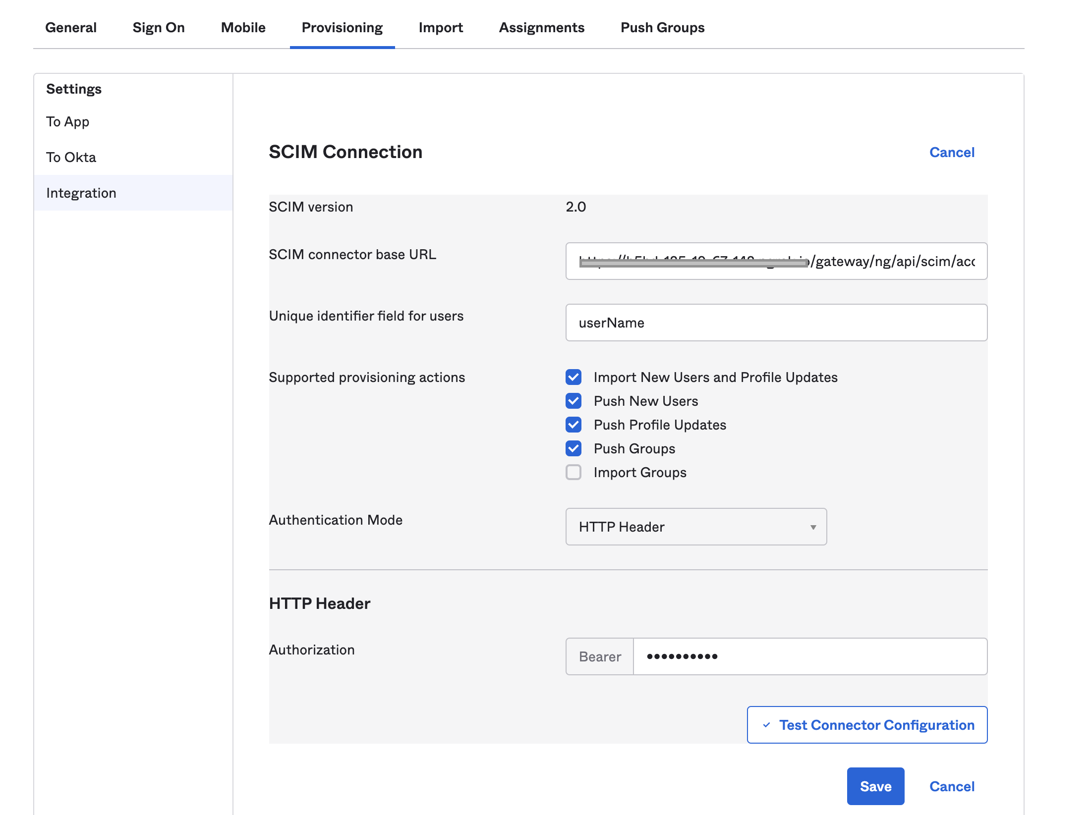 4. For SCIM connector base URL, enter the base URL for your API endpoint.
