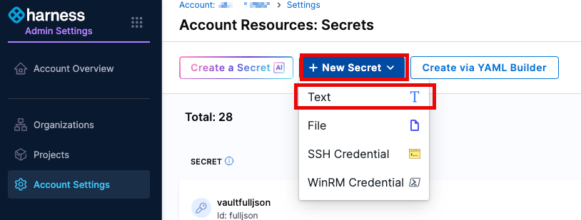 1. Navigate to your secrets list in Harness (Account, Organization, or Project level).