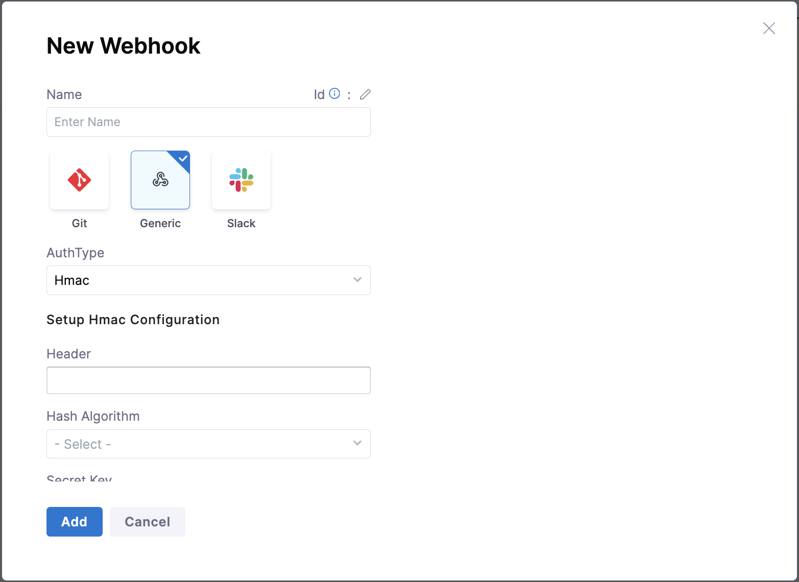 - HMAC: For Hash-Based Message Authentication Code authentication. To set up HMAC Authentication, provide the following details: Header, Hash Algorithm, and Secret Key.