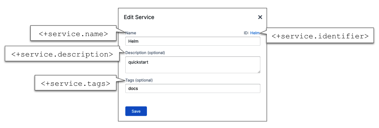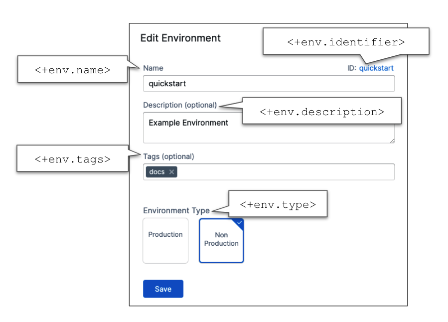 • <+env.identifier>: The entity identifier of the environment used in the current stage.