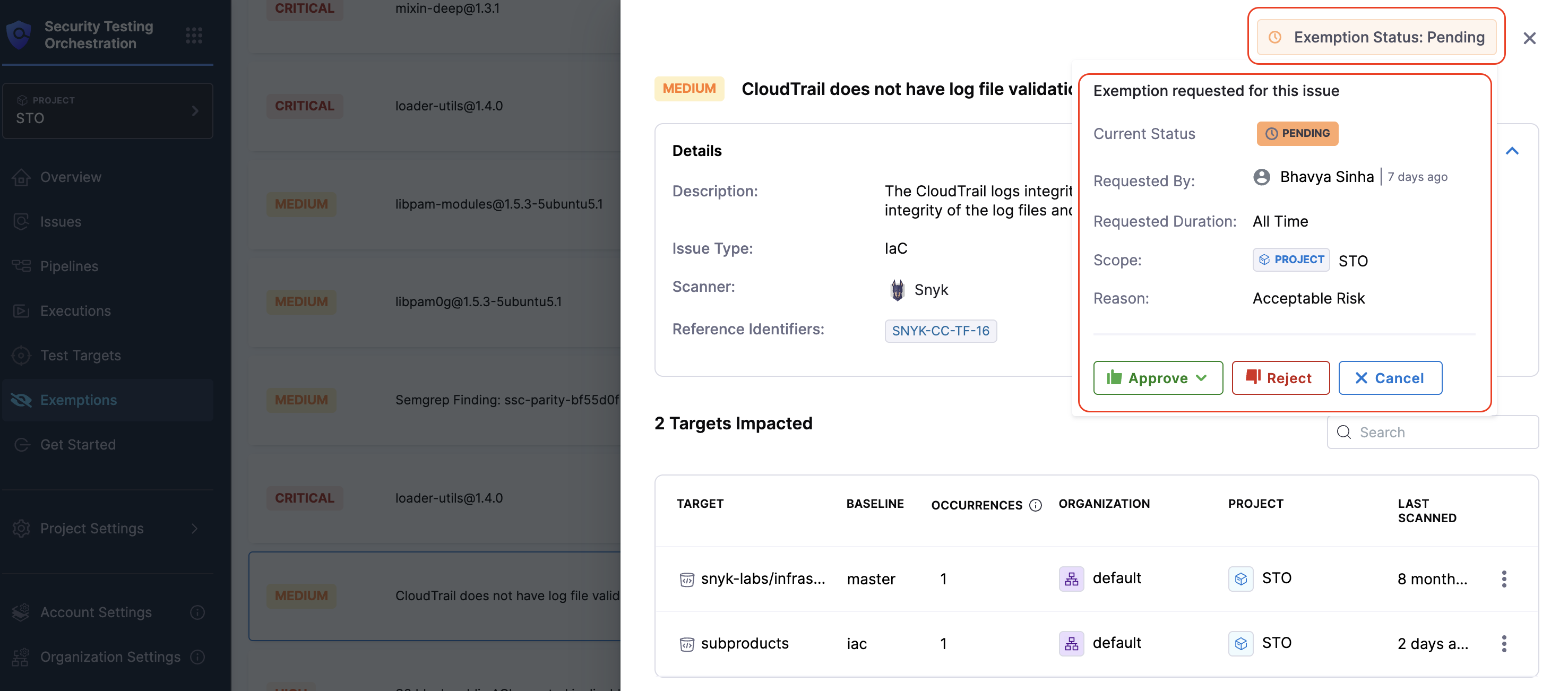 Reviewers have the flexibility to approve exemption requests either at the requested scope or extend the scope to the Organization or Account level during the review process. For more details, refer to Manage Issue Exemptions. To view submitted requests, refer to View Issue Exemptions.