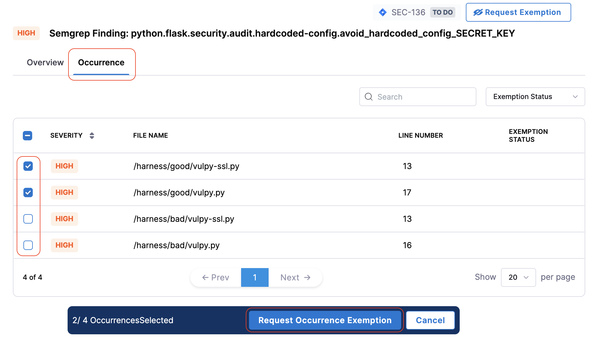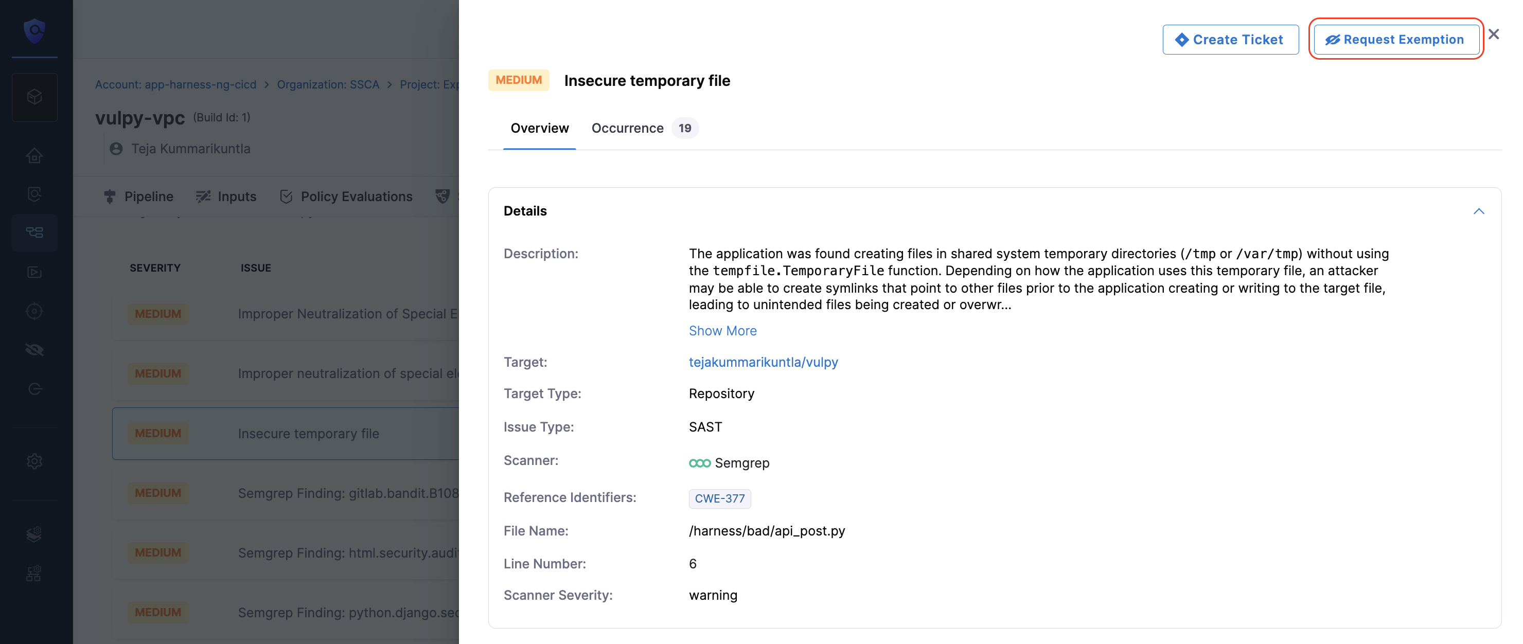 • As you create exemption request at the issue level, all the future occurrences part of this issues will be automatically exempted. For exemptions at occurrences level, refer to Create Exemption Request for Occurrences within Issue