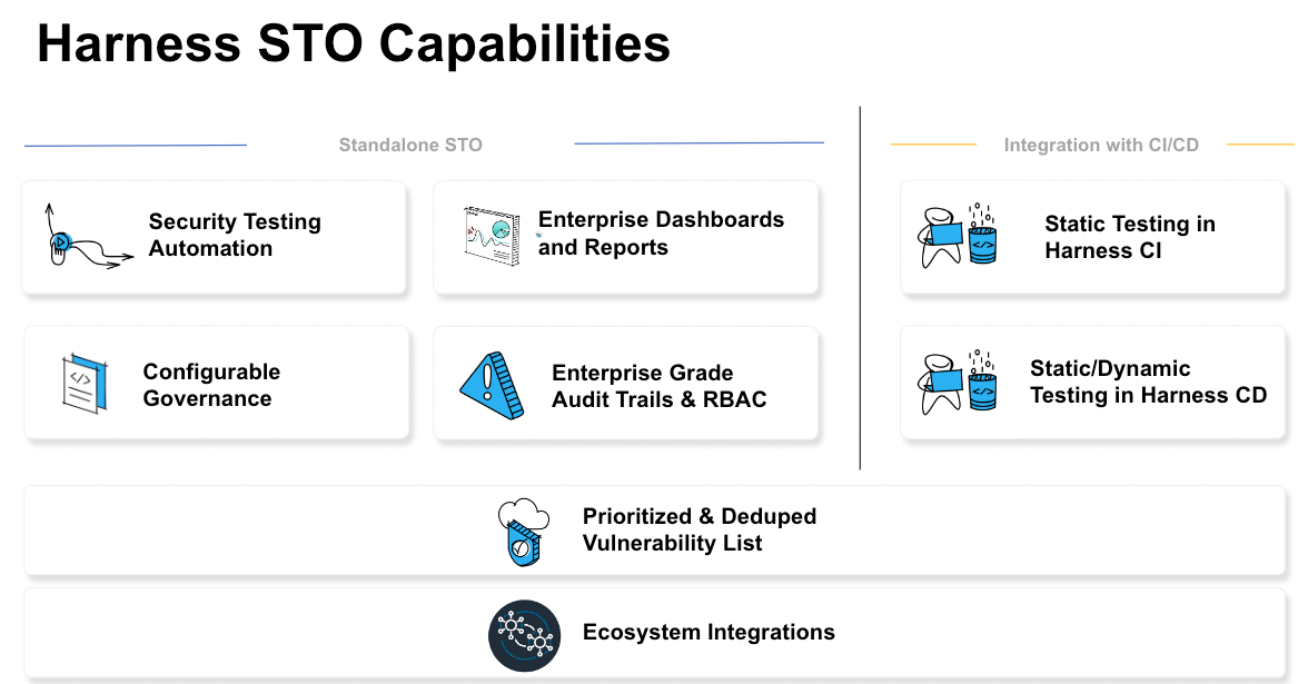 In Harness NextGen, there are no hard distinctions between CI, CD, and STO pipelines. You can create integrated pipelines that implement any mix of CI, CD, and STO use cases. Harness platform components are generic to all three modules: you can use and reuse delegates, connectors, secrets, and other components across across multiple stages and pipelines.