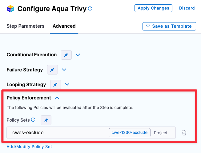 Apply a policy to the scan step to either warn or block the pipeline based on the external policy failures. You can use the sample policy Security Tests - External Policy Failures. Below is a sample policy for reference: