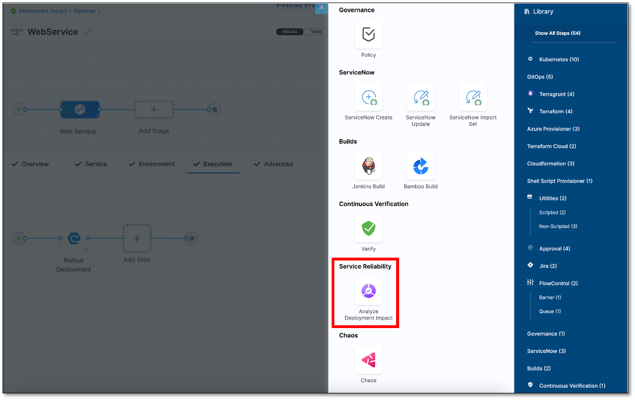 To add the Analyze Deployment Impact step to your pipeline, use one of the methods below.