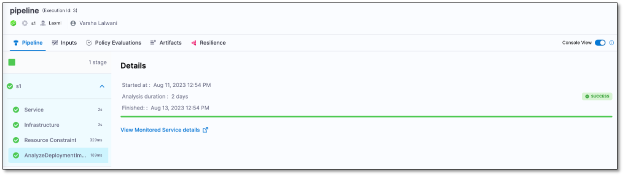• View Monitored Service Details link. Clicking the View Monitored Service Details link opens a new tab, navigates you to the monitored service selected in the Analyze Deployment Impact step, and displays the Impact Analysis Report.