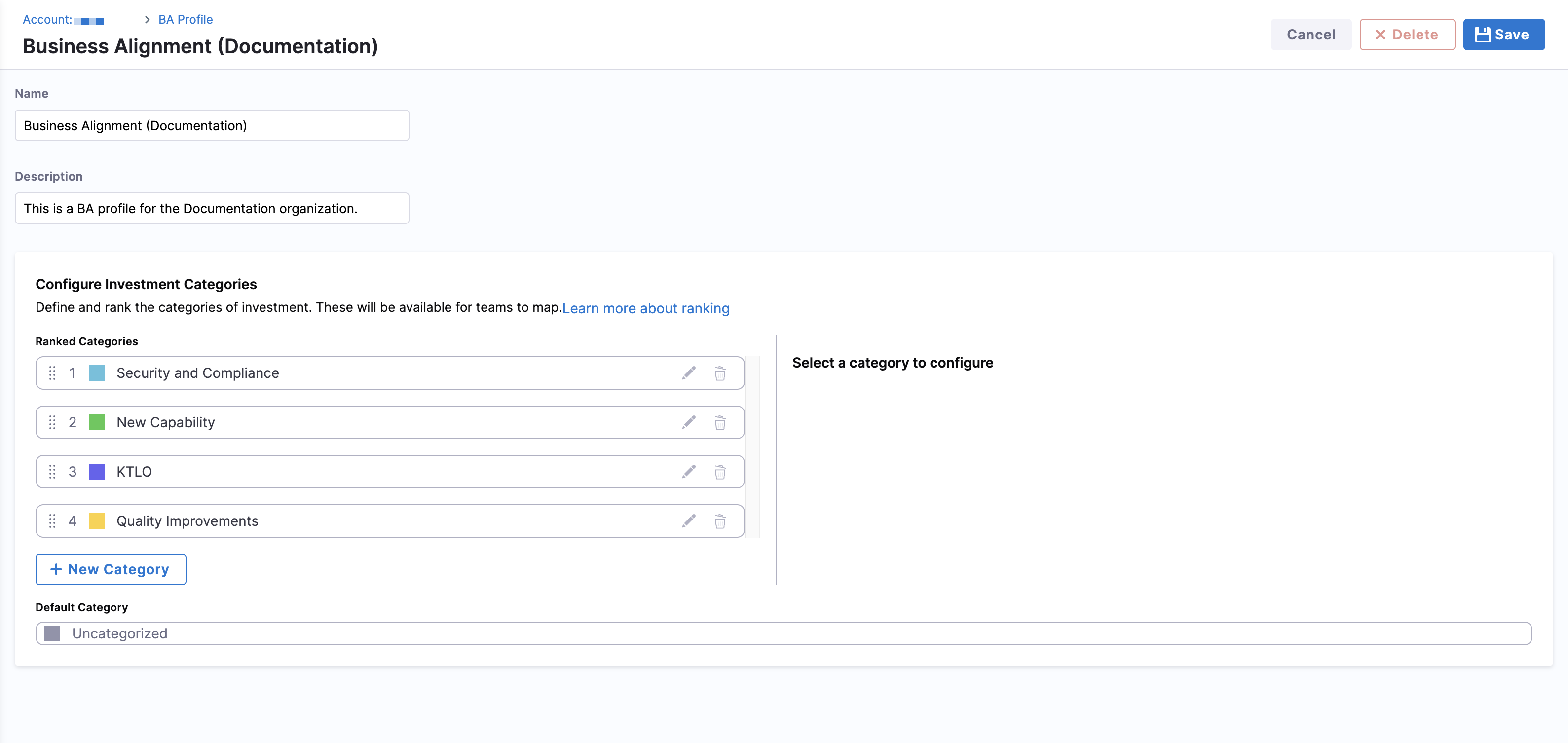 A Business Alignment profile defines the structure for tracking how engineering work aligns with business priorities. It establishes the investment categories to be used across the organization and specifies the scope and rules for fetching work items relevant to Business Alignment metrics.