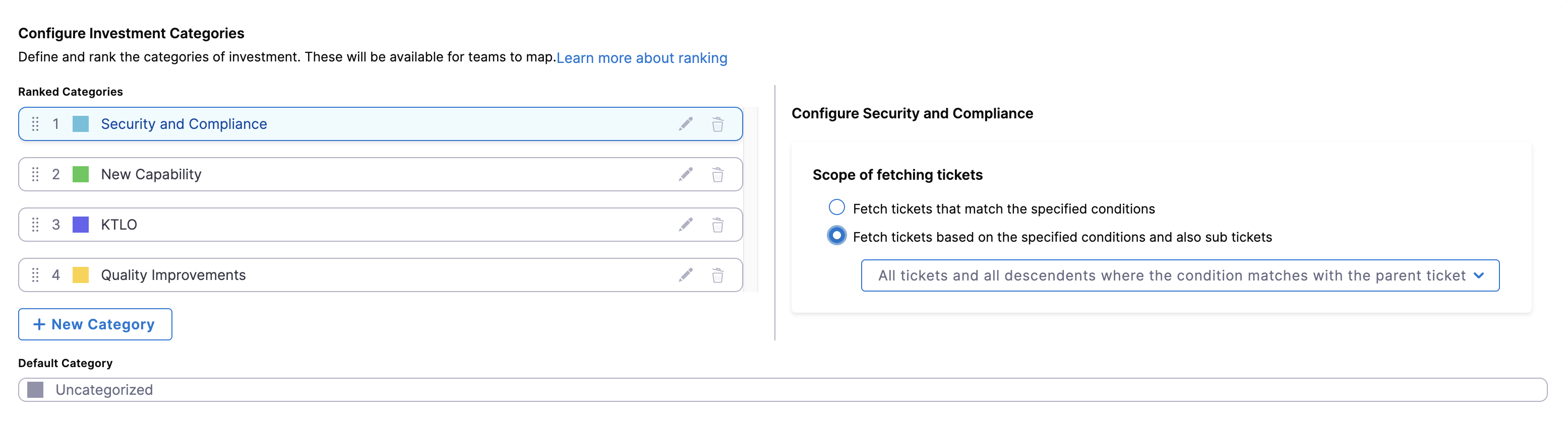 Each Investment Category in the Business Alignment profile defines how tickets should be fetched based on specific criteria and hierarchy rules. This ensures that effort is correctly attributed even in nested work structures like epics, stories, and sub-tasks.