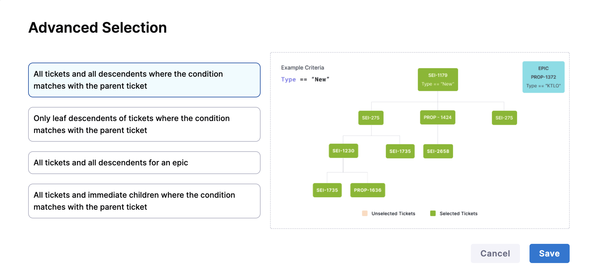 All tickets and all descendents where the condition matches with the parent ticket: Includes the parent ticket and all levels of child tickets (e.g., epics to stories to sub-tasks).